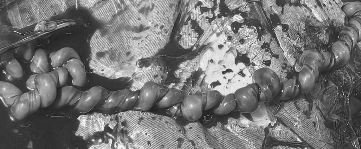 一场与死神的赛跑就此展开,侯晓梅医生一边安抚孕妇及家属情绪,一边联系相关科室。麻醉科、手术室、新生儿科等相关科室迅速做好抢救准备,麻醉、消毒、铺巾..…所有步骤以最快速度完成。手术精准而迅速,从切皮到胎儿娩出仅用时5分钟!术中见:脐带过度扭转,脐带近胎儿脐轮部变细呈索状坏死,血管闭塞。术中脐动脉血气分析提示PH6.8,乳酸高达11.3mmol/L,呈酸中毒状态。新生儿出生时全身苍白,无自主呼吸,Apgar评分1分钟仅2分(濒死状态),新生儿科徐佳鑫主治医师、麻醉科张孝田副主任医师、产科韩仁栋副主任医师等一系列人员组成新生儿窒息抢救团队,立即进行气管插管、正压通气等抢救。经过紧张的10分钟抢救后新生儿终于发出第一声微弱啼哭,心率逐渐回升,在场所有人长舒一口气。