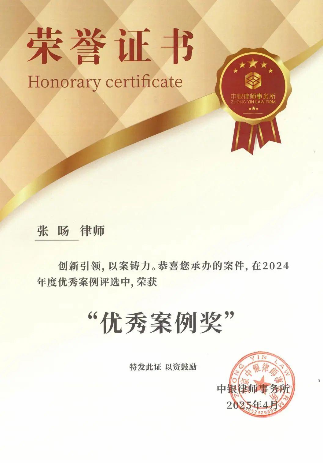 北京中银济宁律师事务所律师张旸荣获总所2024年度优秀案例奖