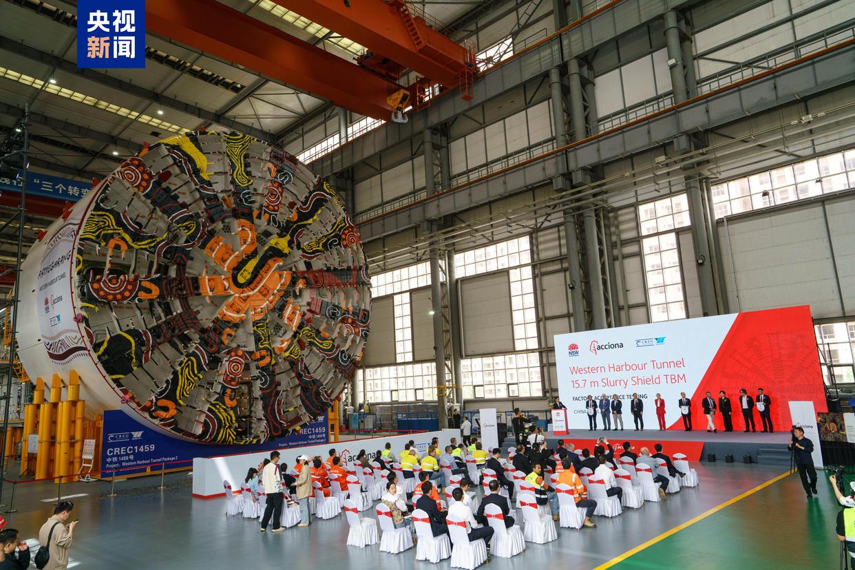 这台刀盘涂装着澳洲本土图腾文化图案的盾构机,开挖直径达15.7米,相当于超5层楼的高度,整机长度约113米,是目前中国出口海外最大直径盾构机,整机集成多项智能化技术。
