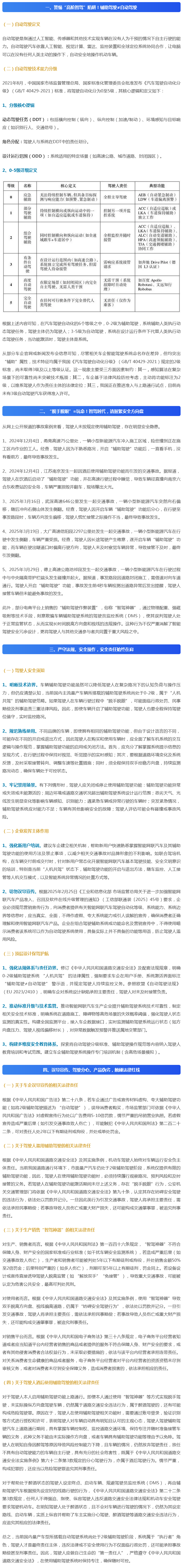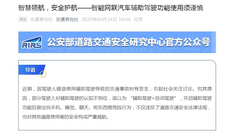 文章称,近期,因驾驶人错误使用辅助驾驶导致的交通事故时有发生,引起社会关注讨论。究其原因,部分驾驶人对辅助驾驶的认知不到位,误以为 “辅助驾驶=自动驾驶”,开启辅助驾驶功能后做出玩手机、睡觉、聊天、吃东西等危险行为,不仅违反了道路交通安全法律法规,也对其他道路使用者的安全构成严重威胁。