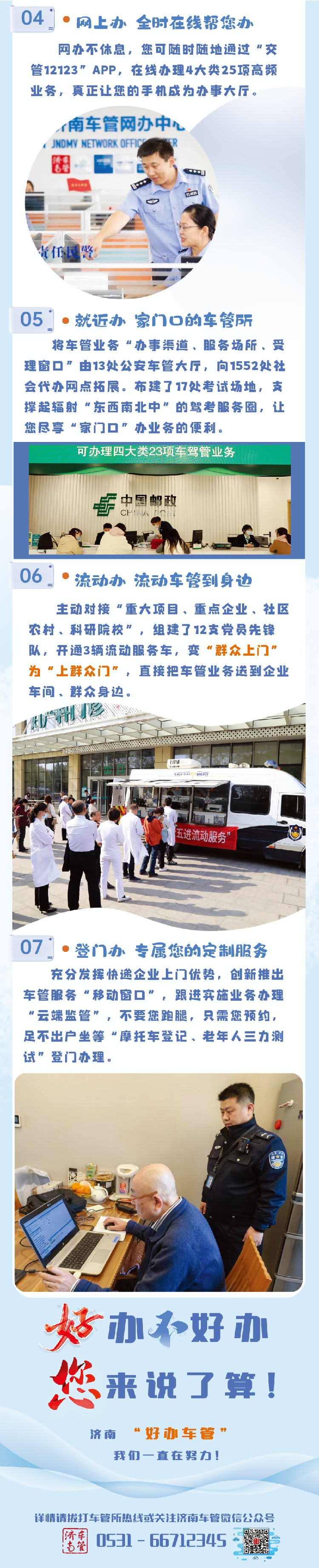 流动办,流动车管到身边。济南车管所主动对接“重大项目、重点企业、社区农村、科研院校”,组建了12支党员先锋队,开通3辆流动服务车,变“群众上门”为“上群众门”,直接把车管业务送到企业车间、群众身边。