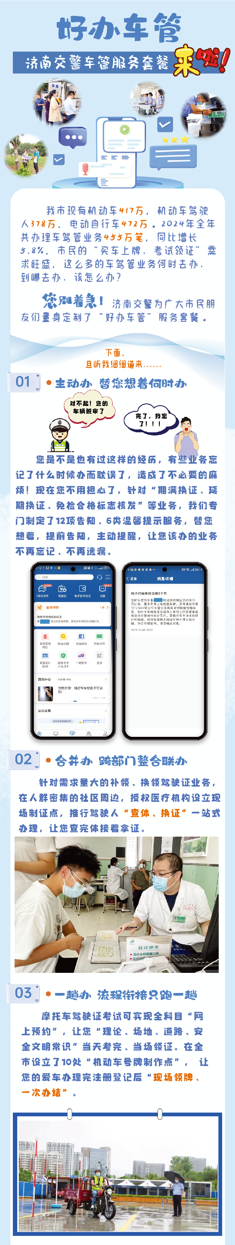 记者从济南市公安局交警支队车辆管理所(以下简称:济南车管所)了解到,济南市现有机动车417万,机动车驾驶人378万,电动自行车472万。2024年全年共办理车驾管业务455万笔,同比增长5.8%,市民的“买车上牌、考试领证”需求旺盛。为此,济南车管所量身定制了“好办车管”服务套餐。