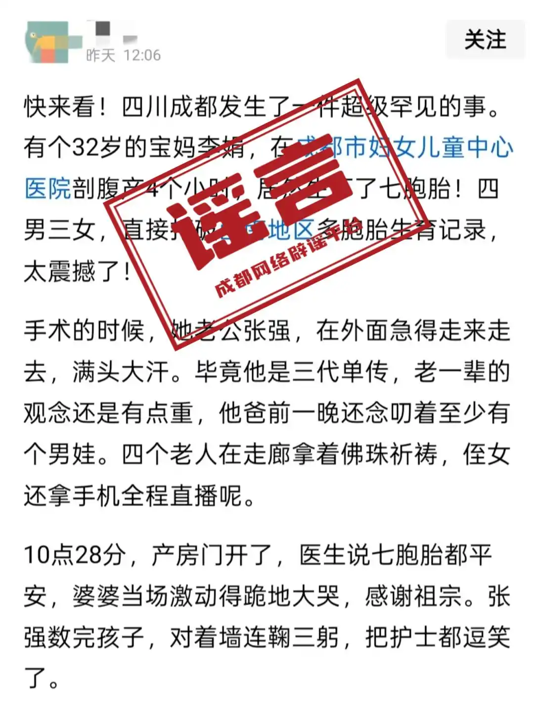 记者注意到,多个自媒体账号所发内容大体均为“一宝妈在成都市妇女儿童中心医院剖腹产4个小时,居然生下了七胞胎!四男三女,直接打破西南地区多胞胎生育纪录”。网文还表示:医院为此提前三个月组建了28人的专业团队,准备了6套预案,才确保生产顺利进行;生产时,老公张某急得满头大汗,四位老人在走廊上默默祈祷,侄女还开启了直播;得知七胞胎平安后,婆婆激动地跪地大哭……