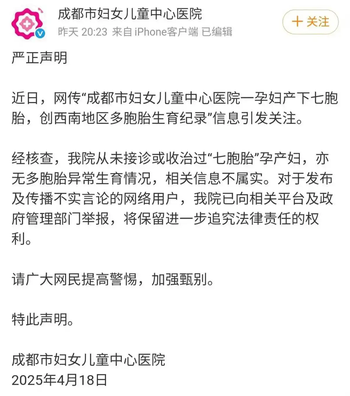 4月18日,四川省成都市妇女儿童中心医院通过官方微博发布声明。声明称,该院从未接诊或收治过“七胞胎”孕产妇,亦无多胞胎异常生育情况,相关信息不属实。对于发布及传播不实言论的网络用户,医院已向相关平台及政府管理部门举报,将保留进一步追究法律责任的权利。