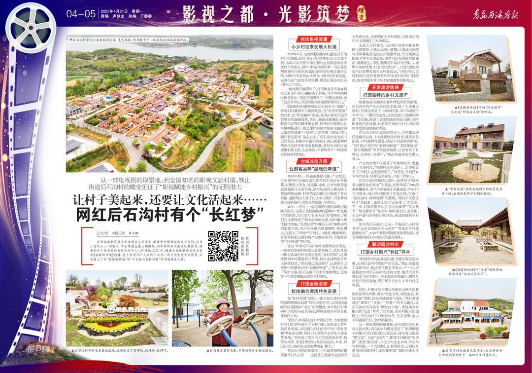 同时,村里计划与周边的杨家山里片区其他村庄联动发展,整合“红色文化、绿色生态、影视文旅”资源,打造全域旅游示范区。“我们希望通过‘影视+’‘文旅+’‘科普+’的多元融合,让后石沟村不仅成为‘网红打卡地’,更成为乡村振兴的‘长红’样本。”刘芳说,在乡村振兴的道路上,后石沟村正以影视为笔、生态为墨,奋力书写着属于自己的精彩篇章。