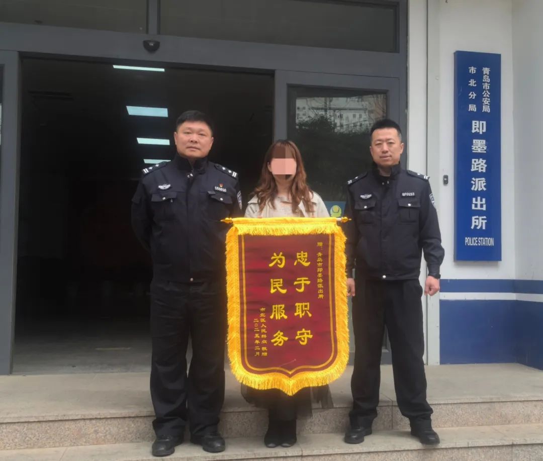4月16日,单女士将一面写有“忠于职守,为民服务”的锦旗送到青岛市公安局市北分局即墨路派出所,向民警帮助其找回丢失手机表示感谢。