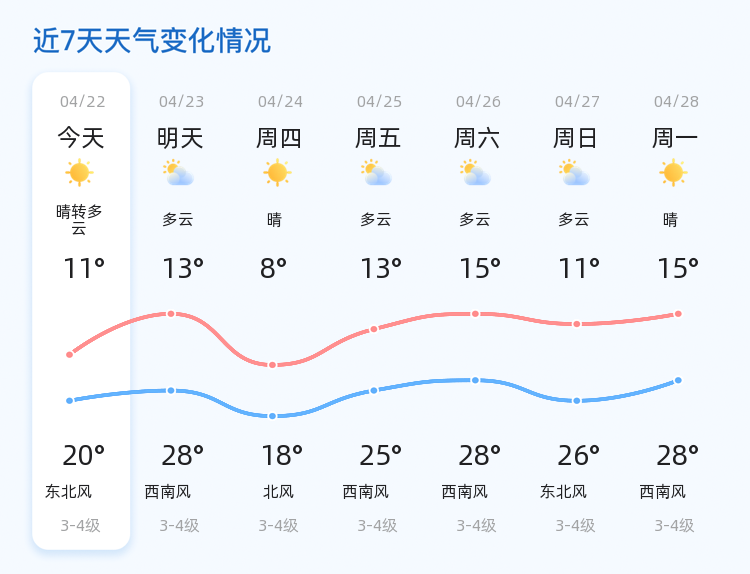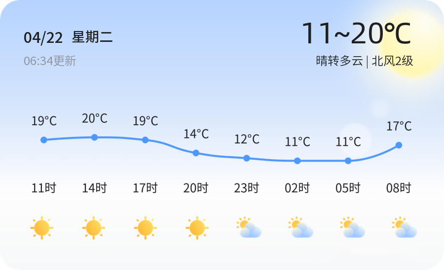 今天是4月22日,星期二,农历三月廿五。滨州今日天气晴转多云,气温在11℃到20℃之间,北风2级,空气湿度为91%。各区天气状况一致,均为晴转多云,风力较小,温度适中。