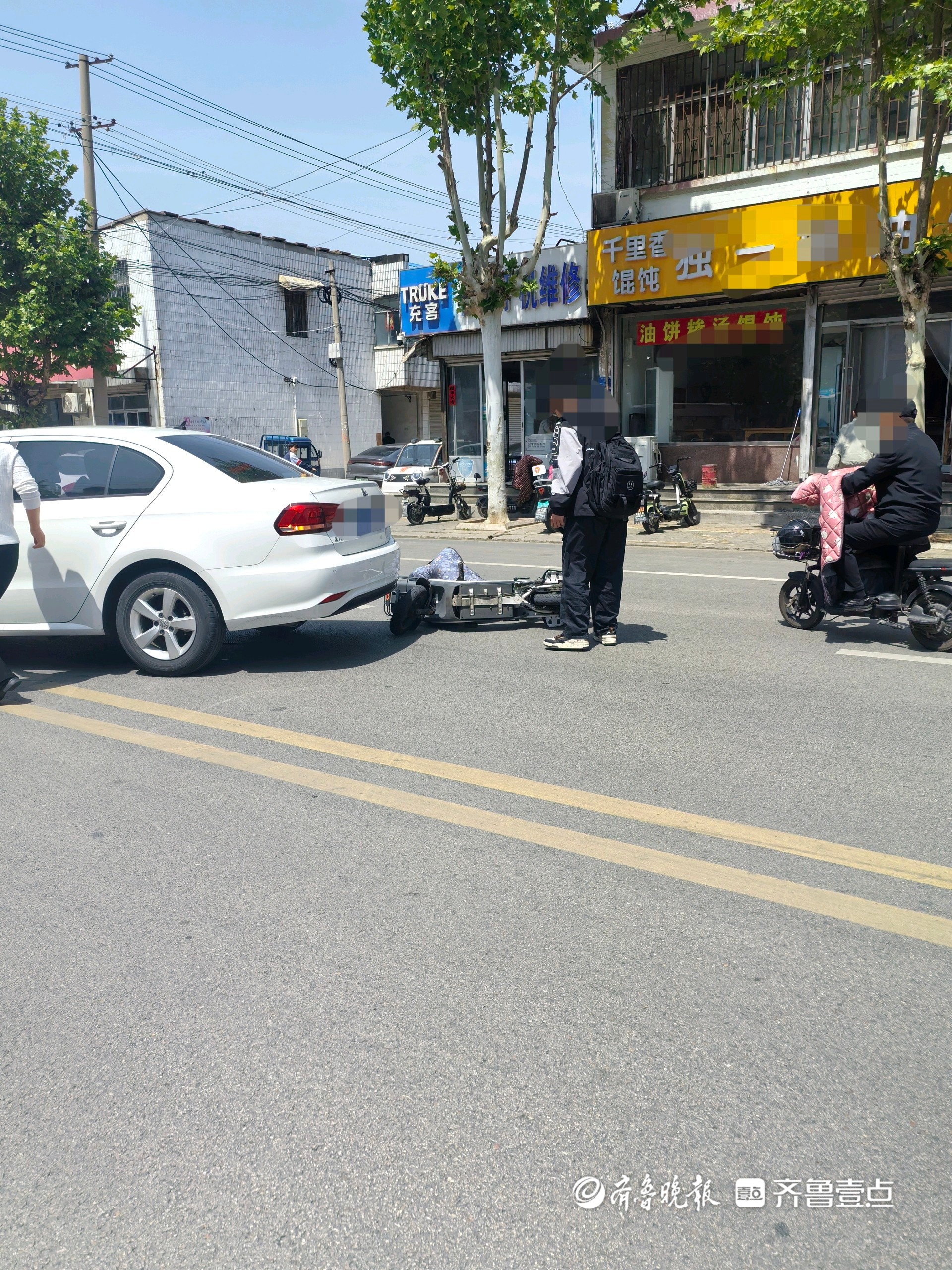 4月22日,情报员“健康快乐壹点”向齐鲁晚报官方客户端齐鲁壹点情报站发来报料称,22日中午11时55分左右,济宁邹城市南开街开发区路段,一辆白色轿车与一辆接孩子放学的两轮电动车发生碰撞事故。