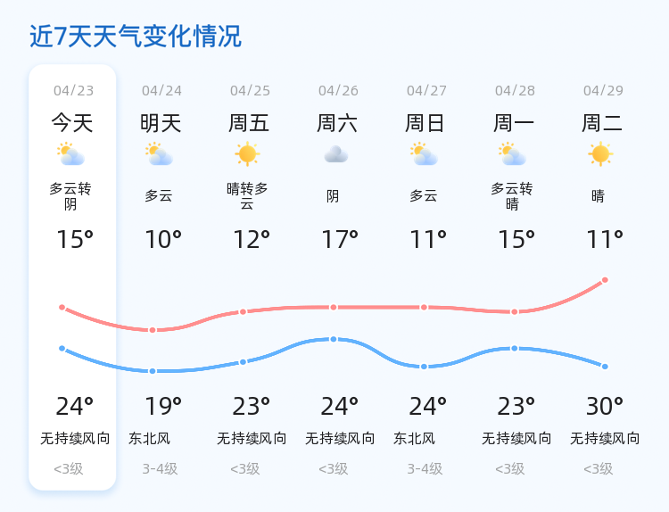 今天是4月23日,星期三,农历三月廿六。菏泽市今日天气多云转阴,气温在15℃至24℃之间,南风1级,空气湿度为64%,PM2.5指数为61。各区天气状况基本一致,市民出行请注意携带雨具,适时增减衣物。 明日天气将转为多云,气温较今日有所下降,最低气温10℃,最高气温19℃。东北风3-4级,市民需注意防风保暖,尤其是早晚时段温差较大,建议增添衣物。 未来三天,菏泽市天气将呈现多变趋势。周五至周日,天气以晴转多云为主,气温在12℃至24℃之间波动。其中,周六和周日部分地区可能出现阴天,市民需关注天气变化,及时调整出行计划。 特别提示近期气温波动较大,市民需注意保暖,避免感冒。阴雨天气时,路面湿滑,驾驶车辆请减速慢行,确保行车安全。