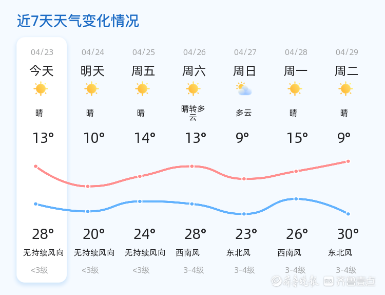 明天(4月24日)天气仍然晴朗,但气温有所下降,最低气温10℃,最高气温20℃。相较于今天,市民会感受到明显的凉爽。
