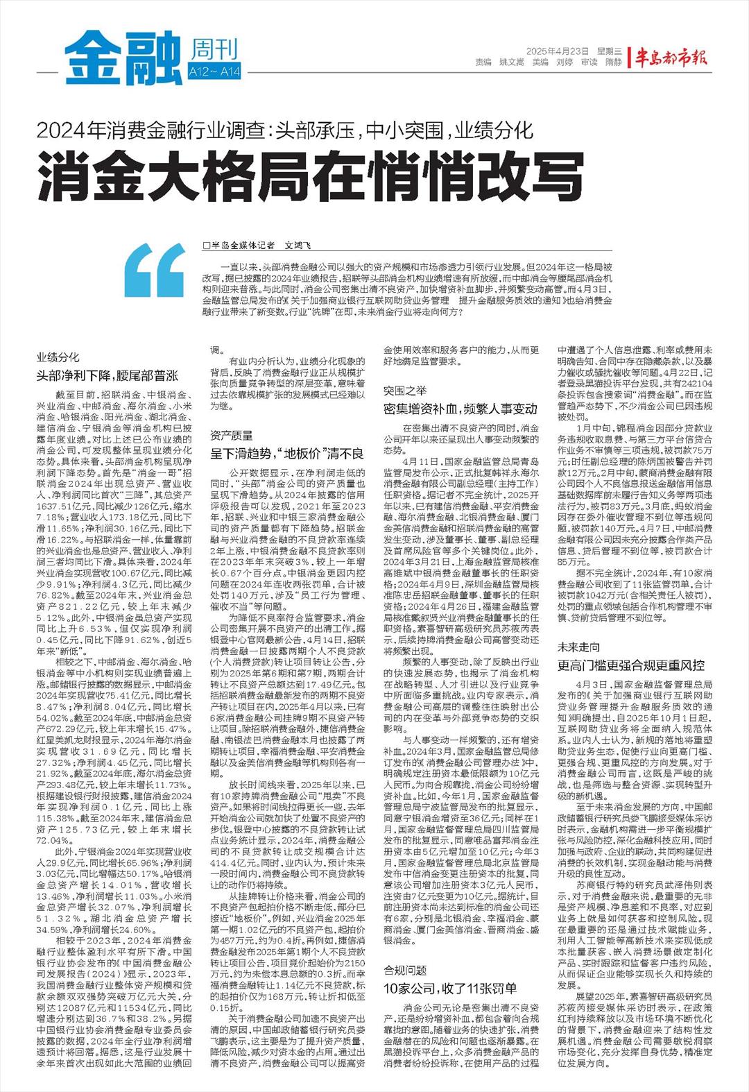 一直以来,头部消费金融公司以强大的资产规模和市场渗透力引领行业发展。但2024年这一格局被改写,据已披露的2024年业绩报告,招联等头部消金机构业绩增速有所放缓,而中邮消金等腰尾部消金机构则迎来普涨。与此同时,消金公司密集出清不良资产,加快增资补血脚步,并频繁变动高管。而4月3日,金融监管总局发布的《关于加强商业银行互联网助贷业务管理提升金融服务质效的通知》也给消费金融行业带来了新变数。行业“洗牌”在即,未来消金行业将走向何方?