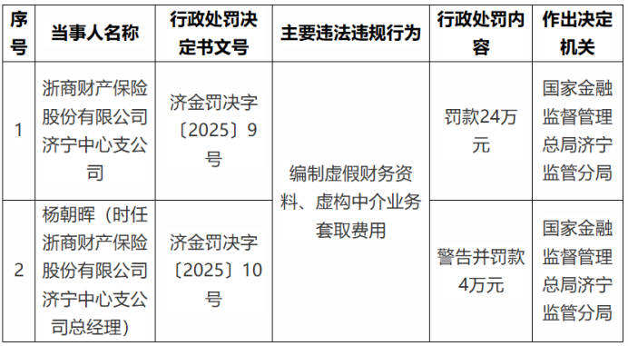 4月21日,国家金融监督管理总局山东监管局官网公示的行政处罚决定书(济金罚决字〔2025〕9号)显示,浙商财产保险有限公司济宁中心支公司因编制虚假财务资料、虚构中介业务套取费用被罚款24万元。同时,行政处罚决定书(济金罚决字〔2025〕10号)显示,杨朝晖,时任浙商财产保险股份有限公司济宁中心支公司总经理因对上述违法违规事实负有责任,被警告并罚款4万元。