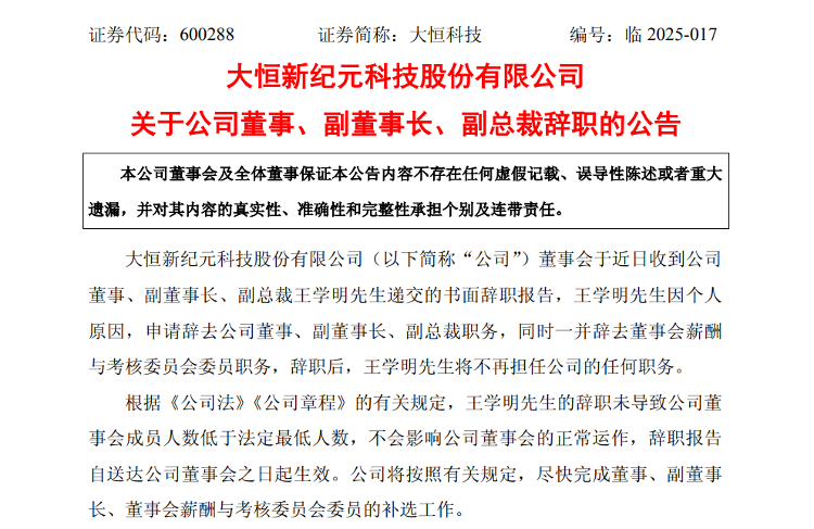 4月22日晚,大恒科技发布公告称,收到公司董事、副董事长、副总裁王学明递交的书面辞职报告。王学明因个人原因,申请辞去公司董事、副董事长、副总裁职务,同时一并辞去董事会薪酬与考核委员会委员职务,辞职后,王学明将不再担任大恒科技的任何职务。