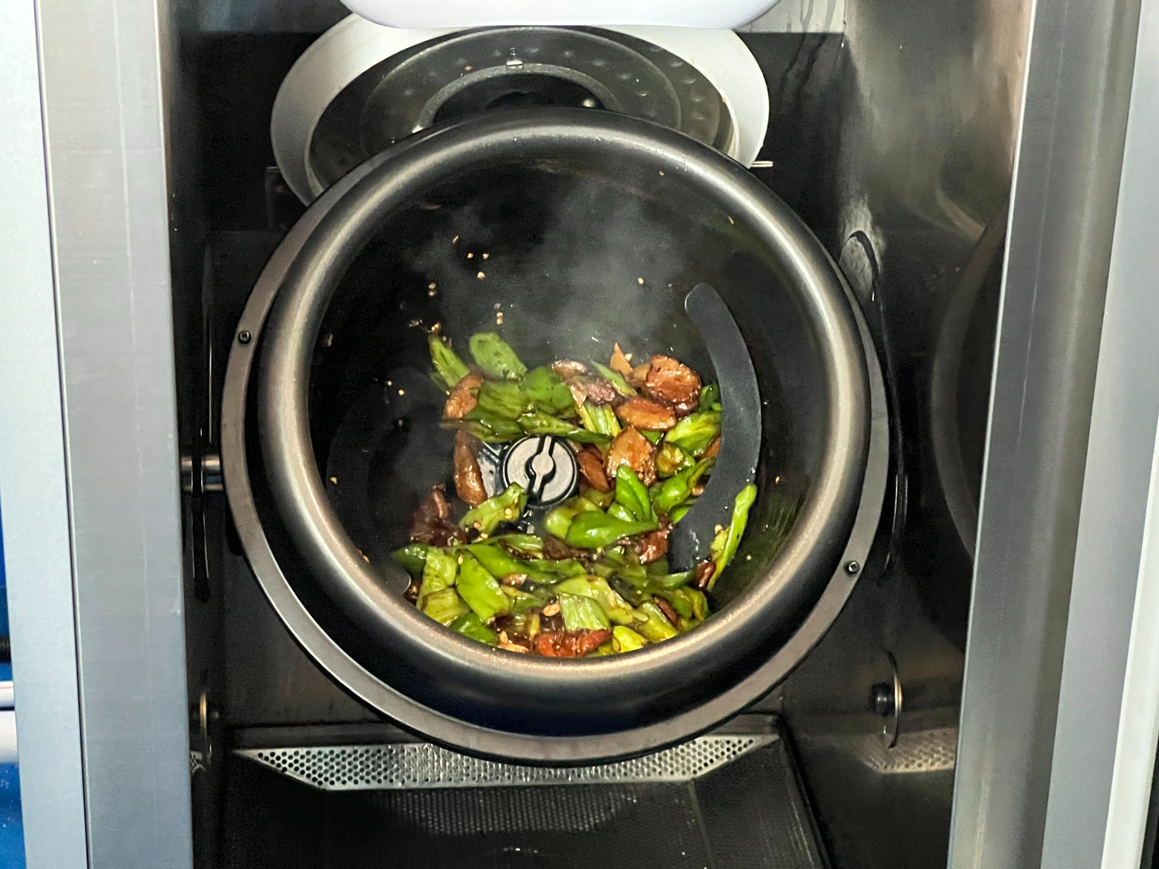 “滋滋”的爆油声与翻炒韵律中,一台形似太空舱的银色机器正在施展“魔法”。透过观察窗,游客们屏息凝视:悬空旋转的球型炒锅内,青椒与肉片在260℃高温中翻飞起舞,六个调料盒如同钢琴琴键般精准弹奏,酱油、盐水的注入分毫不差。4分钟后,锅体180度翻转,冒着热气的菜肴滑入瓷盘,整个过程无人触碰锅铲,却完美复刻了猛火快炒的“镬气”。