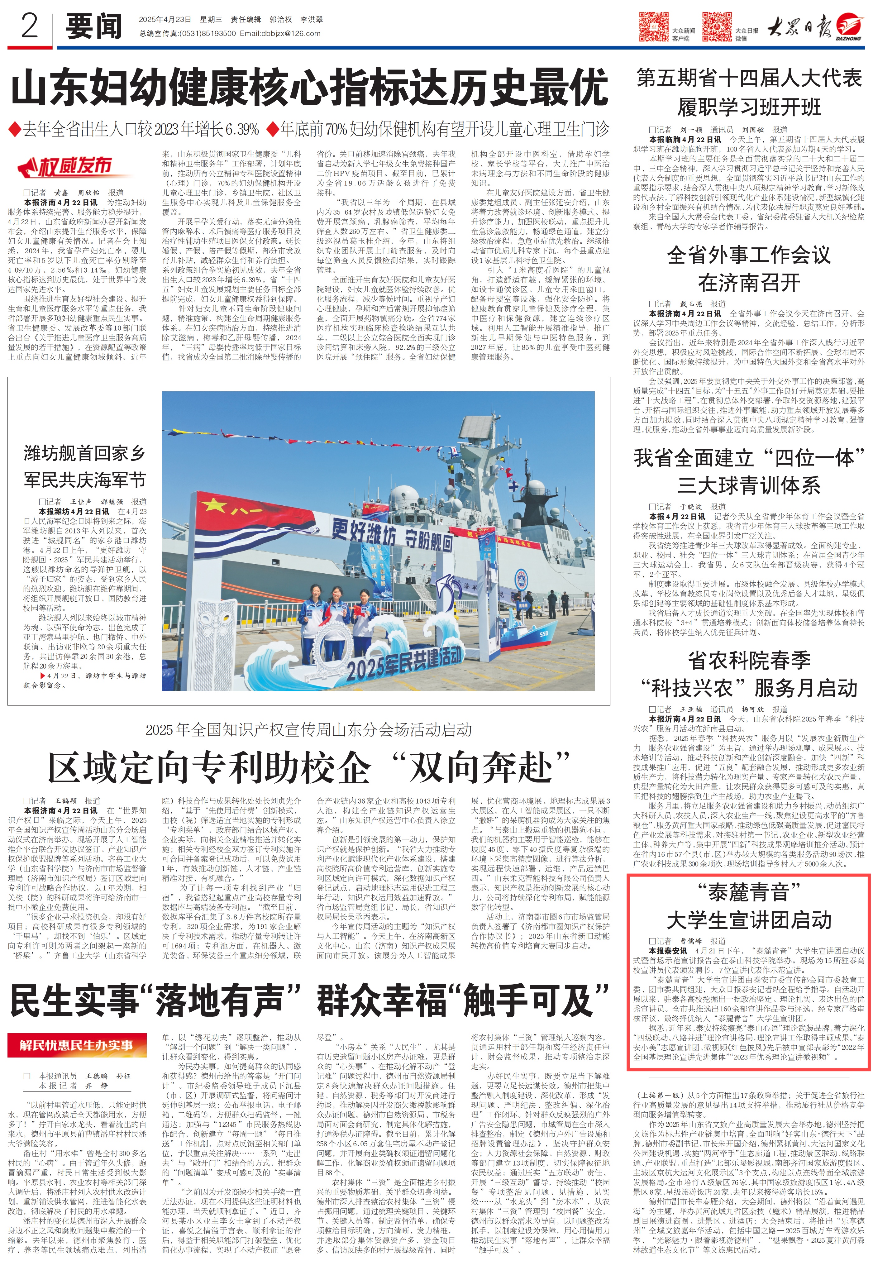 4月23日,2版要闻刊发《“泰麓青音”大学生宣讲团启动》,报道“泰麓青音”大学生宣讲团启动仪式暨首场示范宣讲报告会在泰山科技学院举办。详情点击这里——《“泰麓青音”大学生宣讲团启动》