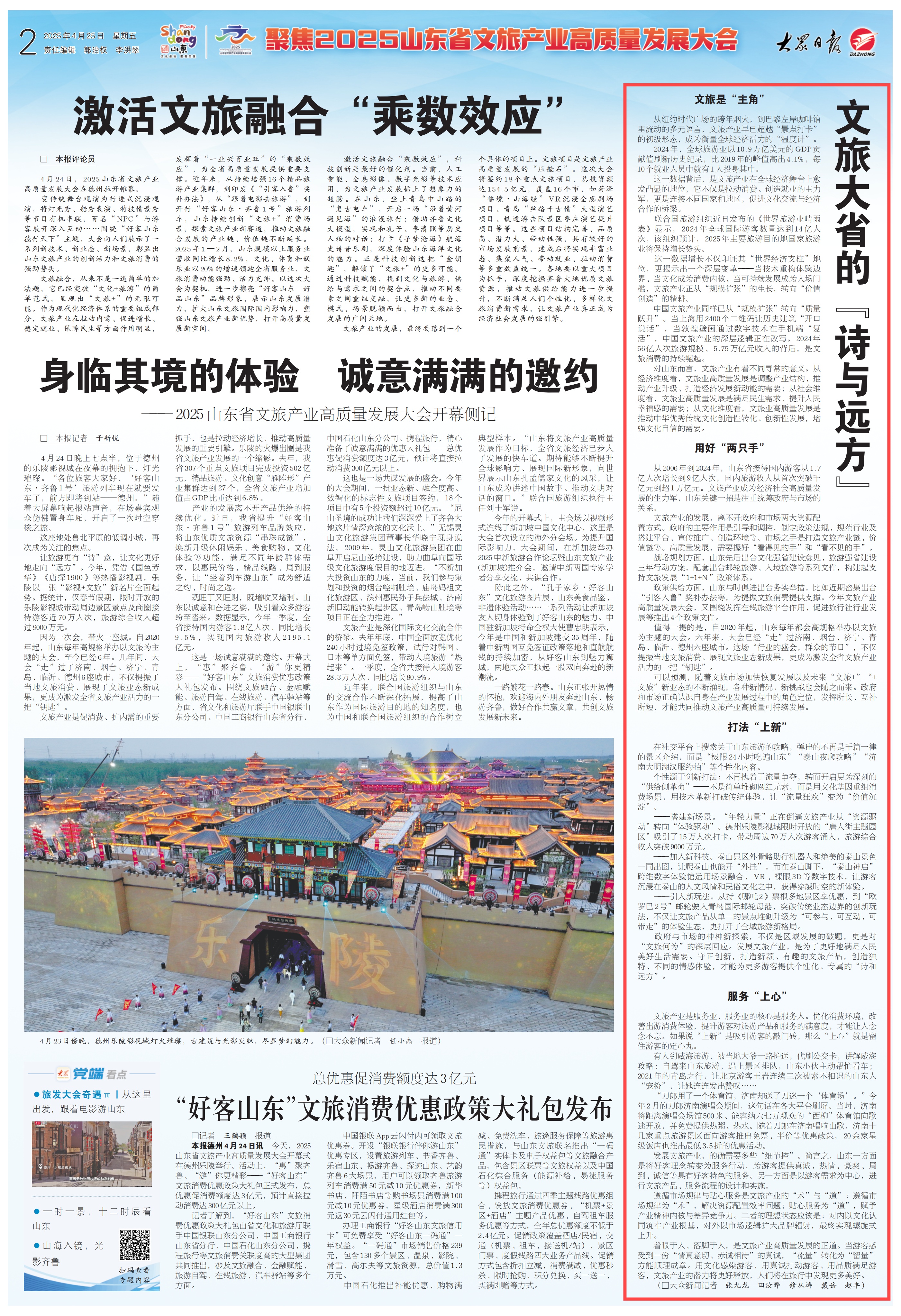 4月25日,2版要闻刊发《文旅大省的“诗与远方”》,报道泰山景区外骨骼助行机器人和绝美的泰山景色一同出圈,让爬泰山也能开“外挂”。详情点击这里——《文旅大省的“诗与远方”》
