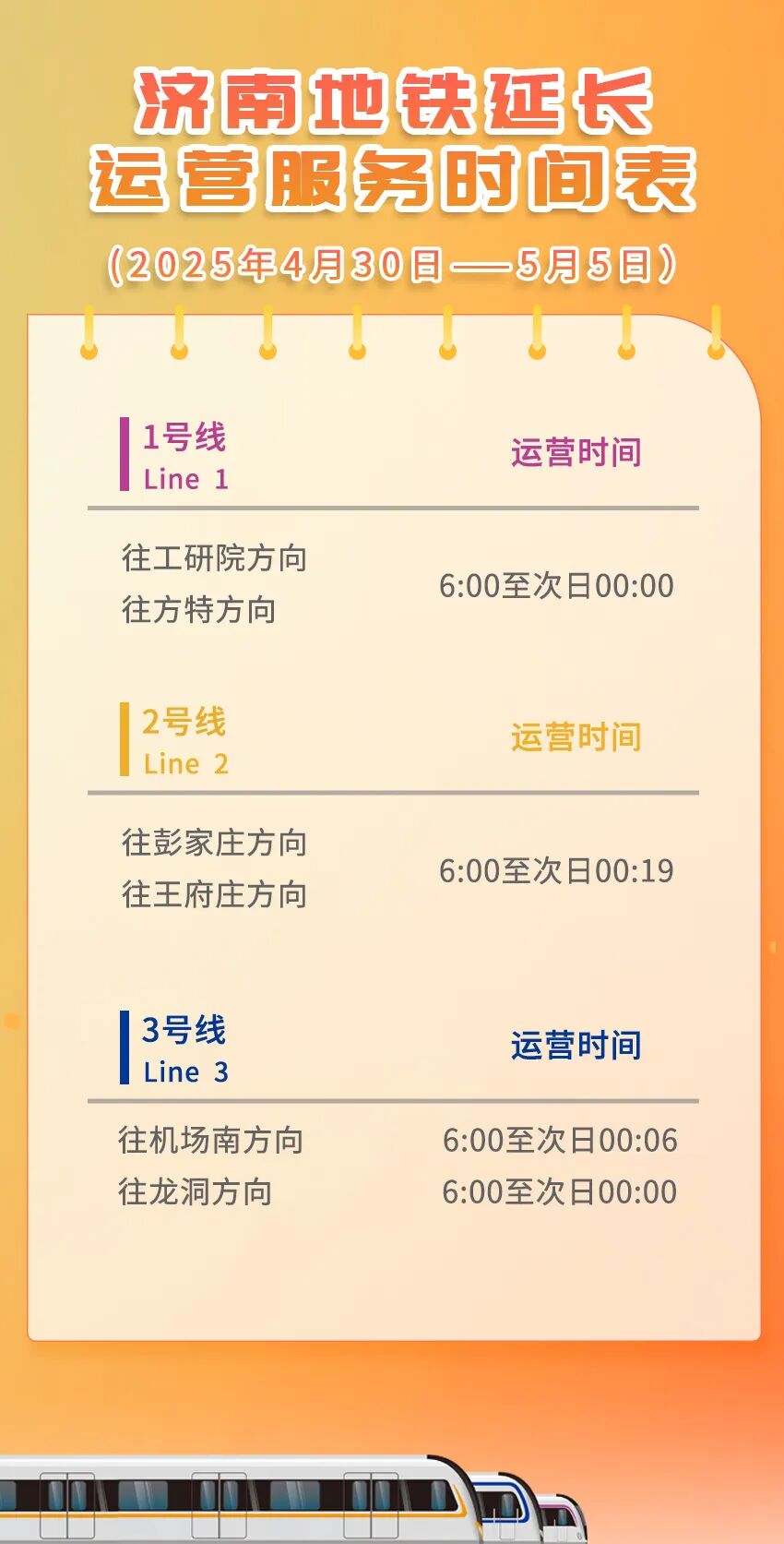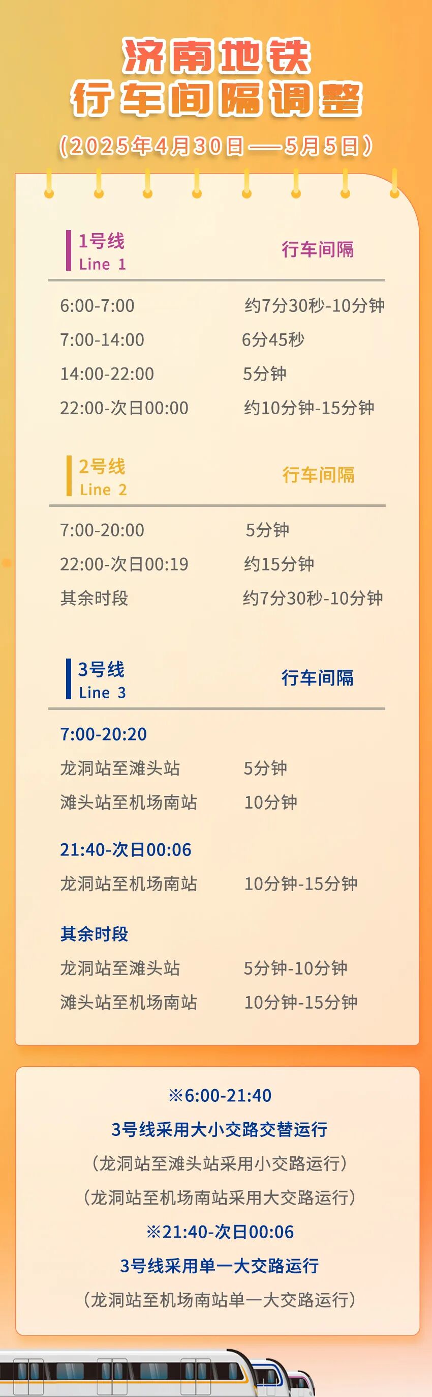 4月30日至5月5日期间,列车到发时刻、行车间隔均有调整,请您提前规划出行时间。节假日及活动期间济南地铁将实时监测现场客流动态,灵活采取延长停站时间,增开备用车等措施,全力保障市民乘客安全便捷出行。