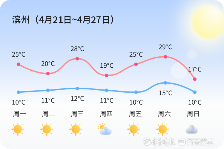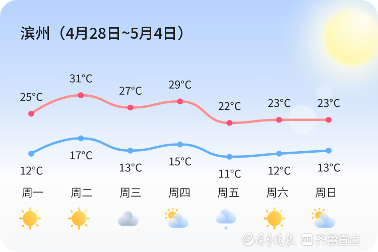 全市周平均最高温25℃,平均最低温13℃,平均气温19℃,周最高气温31℃,出现在周二,周最低温11℃,出现在周五。