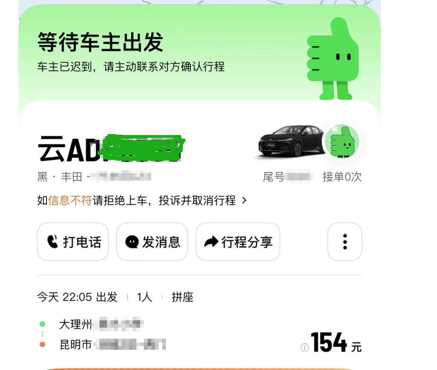 4月20日,朋友通过滴滴平台为李女士预约了一辆从大理开往昆明的顺风车,订单信息显示,接单车辆为云A号牌的黑色丰田轿车,价格是154元。司机曾致电李女士,商议高速通行费用的分摊事宜,费用大约在80元,李女士对此表示同意。