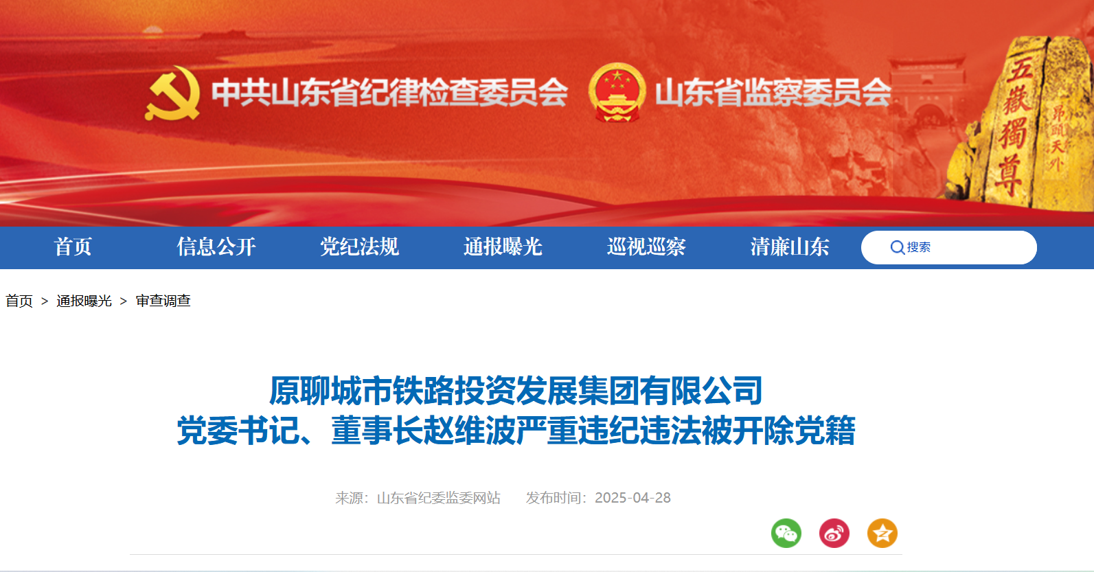 山东省纪委监委网站4月28日通报,原聊城市铁路投资发展集团有限公司党委书记、董事长赵维波严重违纪违法被开除党籍。