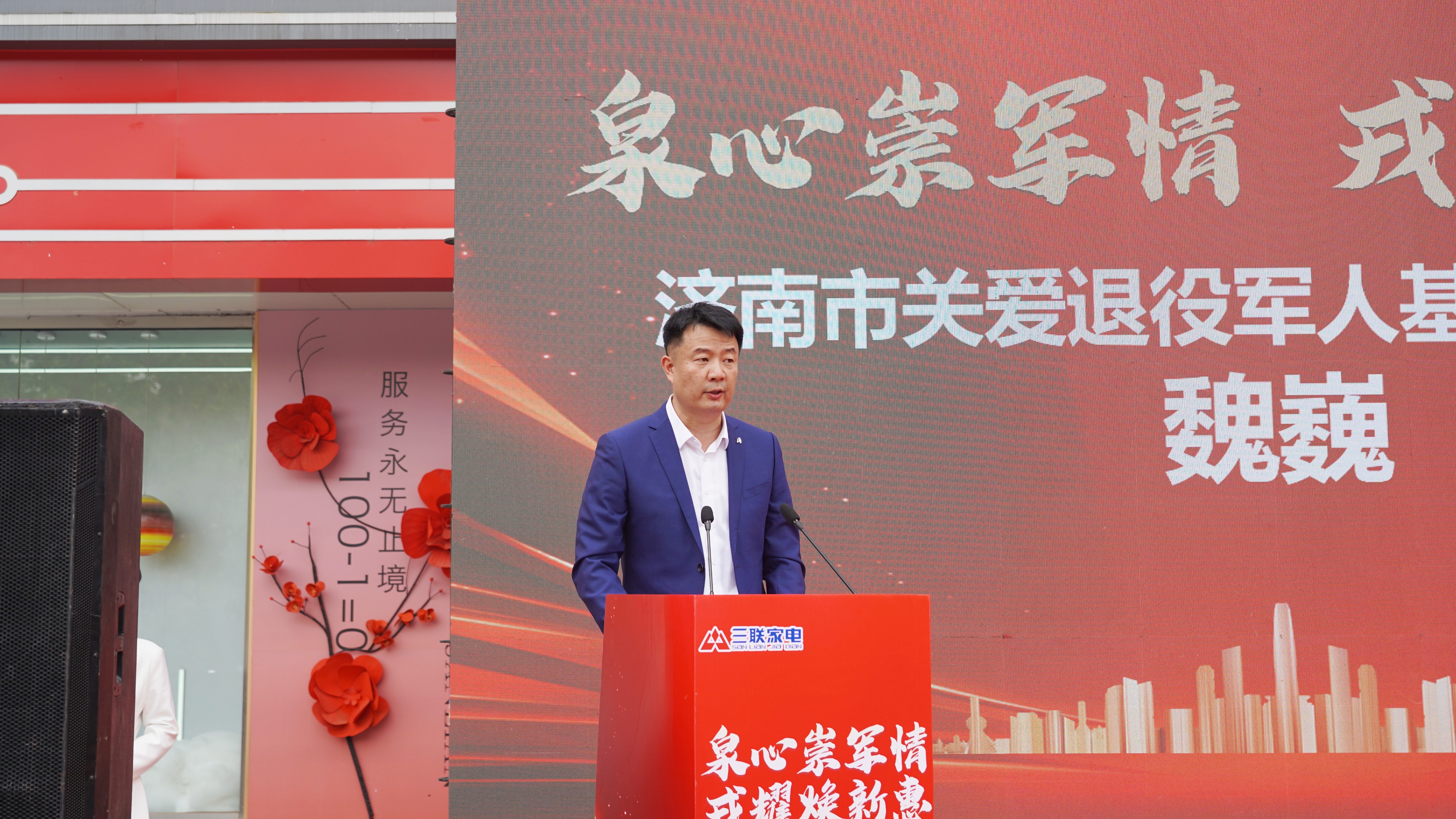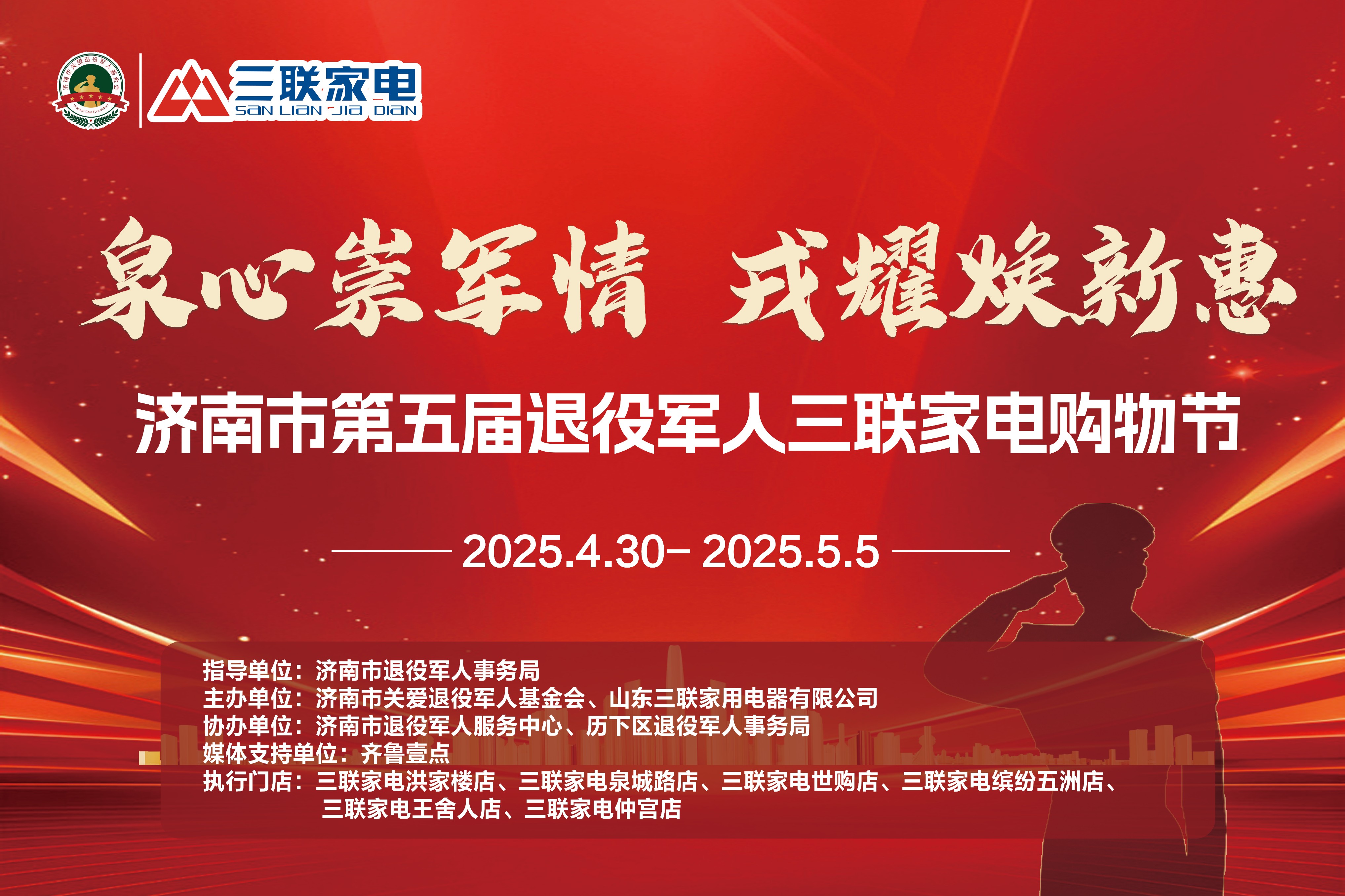 活动由济南市关爱退役军人基金会、山东三联家用电器有限公司联合主办,旨在通过政企协作,为现役、退役军人及优抚对象提供专属消费补贴与暖心服务,进一步弘扬尊军崇军的社会风尚。