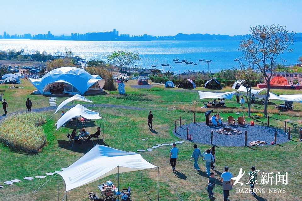 人们在青岛西海岸新区鱼鸣海角露营地游玩。
