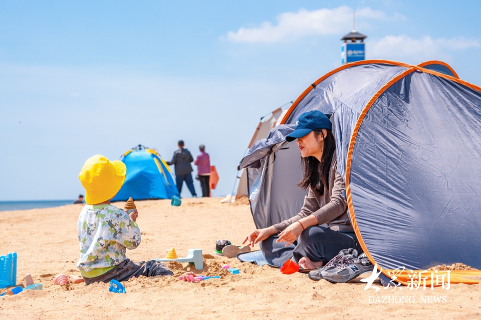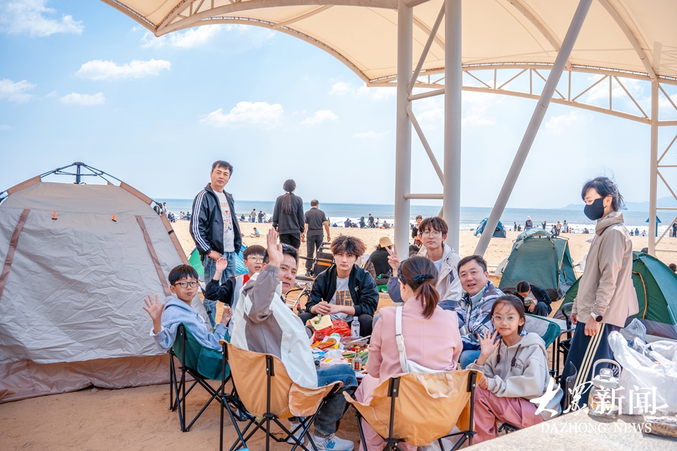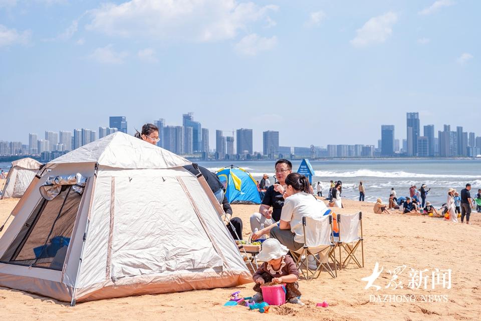 5月3日,人们在青岛西海岸新区灵山湾海水浴场沙滩上支起帐篷,露营游玩。