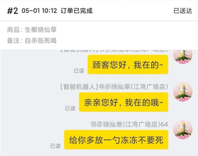 5月1日上午,一个外卖订单引起了店员的注意,备注上写着“自杀临死喝”。店员看到这个消息立刻在平台上联系这名顾客。看到对方发来想要轻生的文字,店员回复:“给你多放一勺冻冻不要死”,同时赶紧联系了店主。店主打了几次顾客电话都被挂断,不得已只能继续在线上沟通。