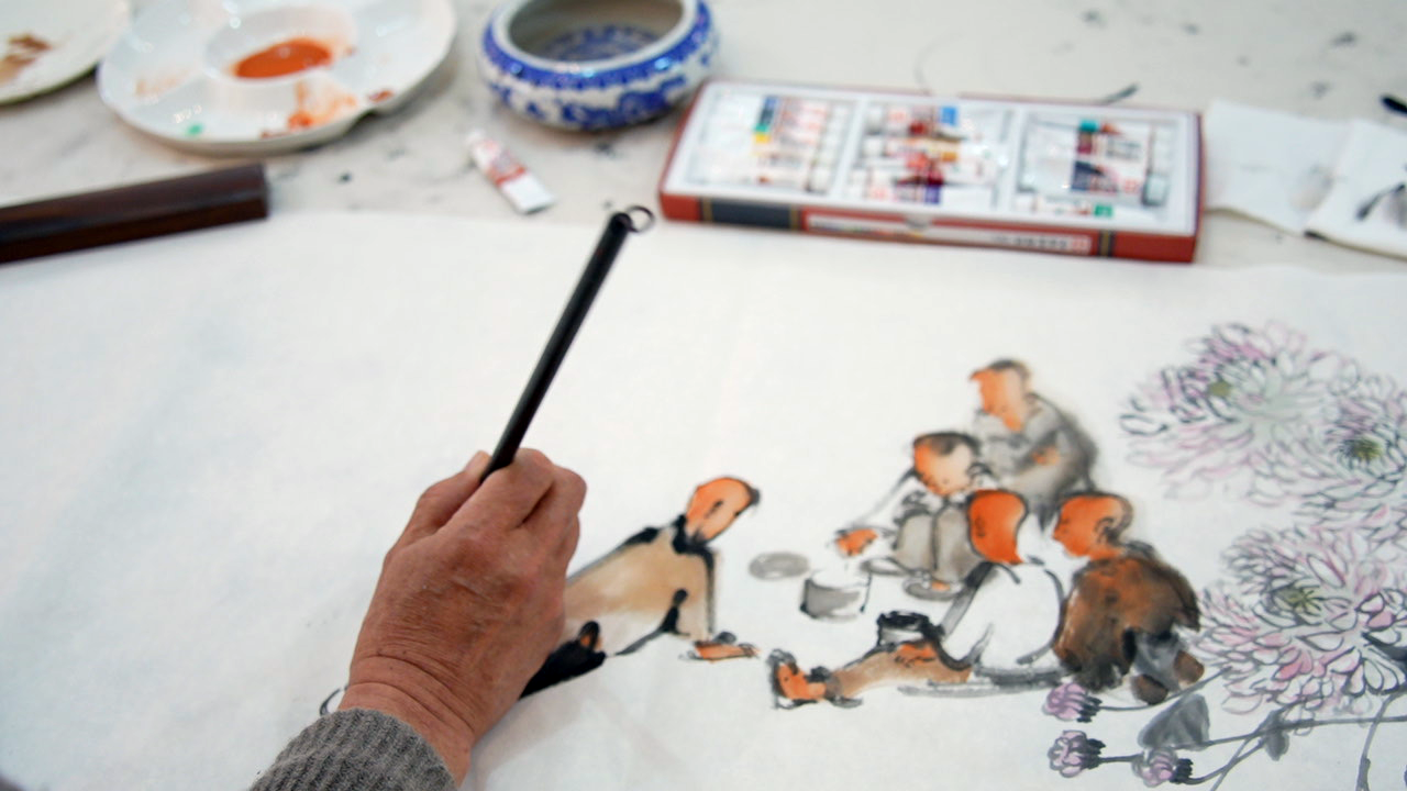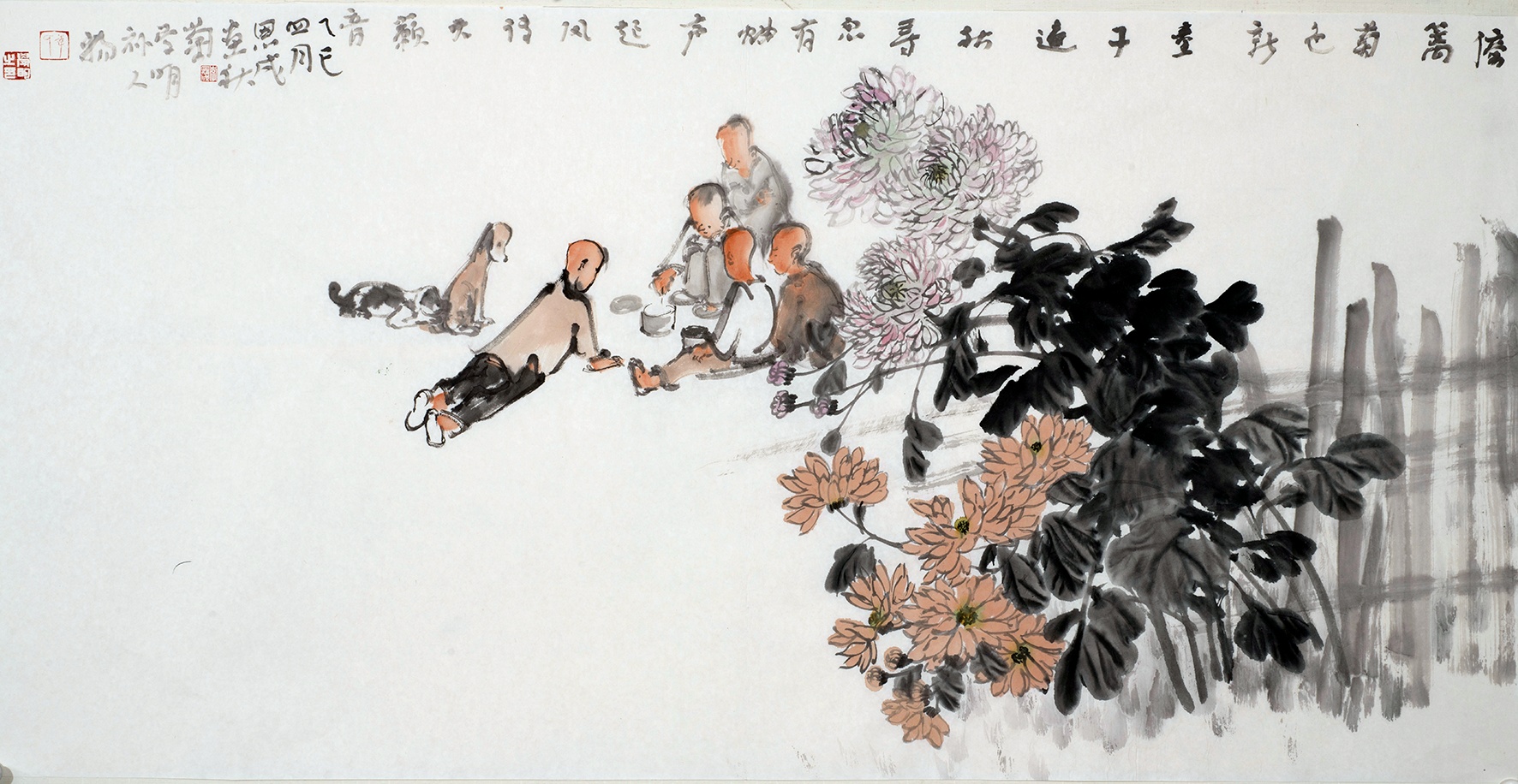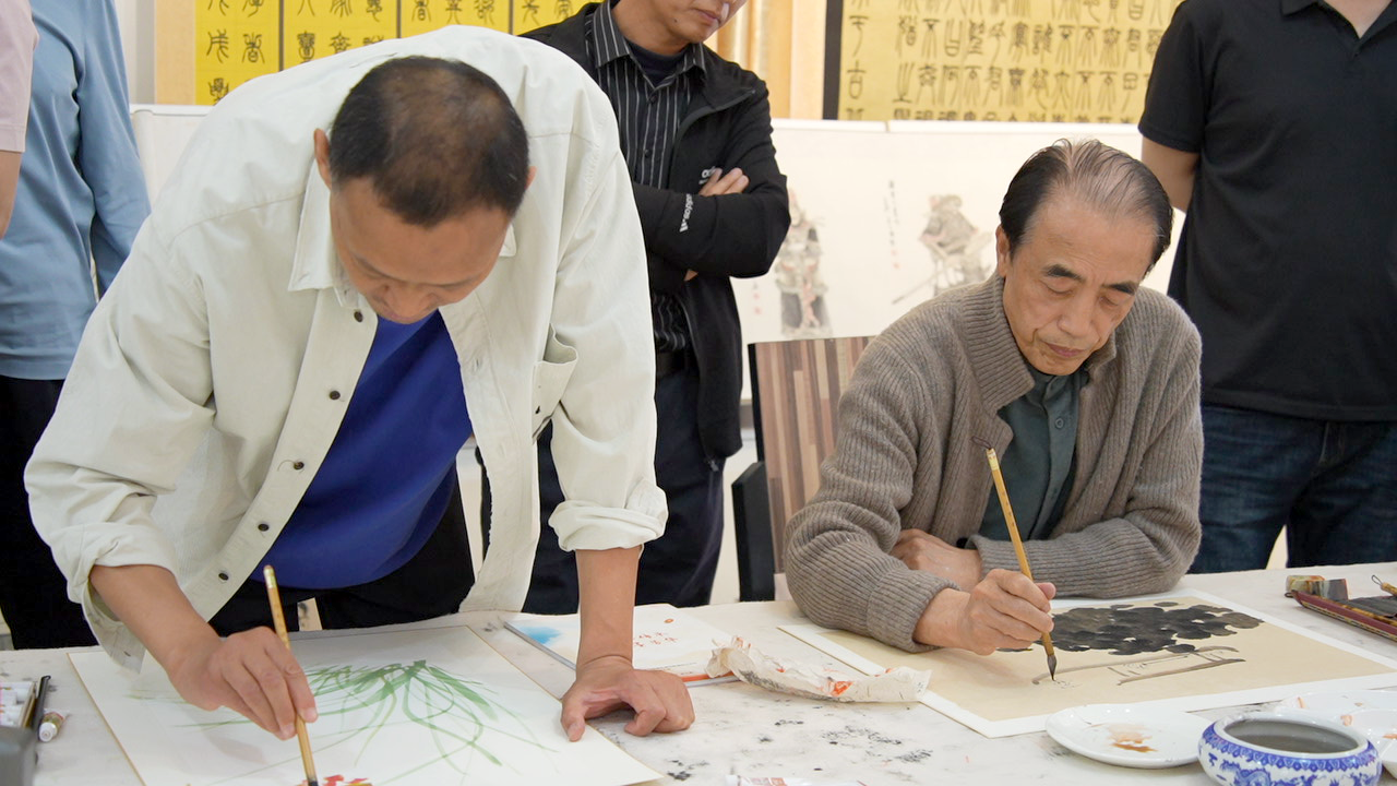 “当恩成笔下的秋菊与我的逗蛐蛐童子在丈二宣纸上相逢时,墨色洇染出两个农村孩子的隔空击掌。这种无需言说的默契,或许源于我们共有的精神胎记——那些刻在骨血里的农耕记忆,总会在某个顿笔的瞬间破土而出。