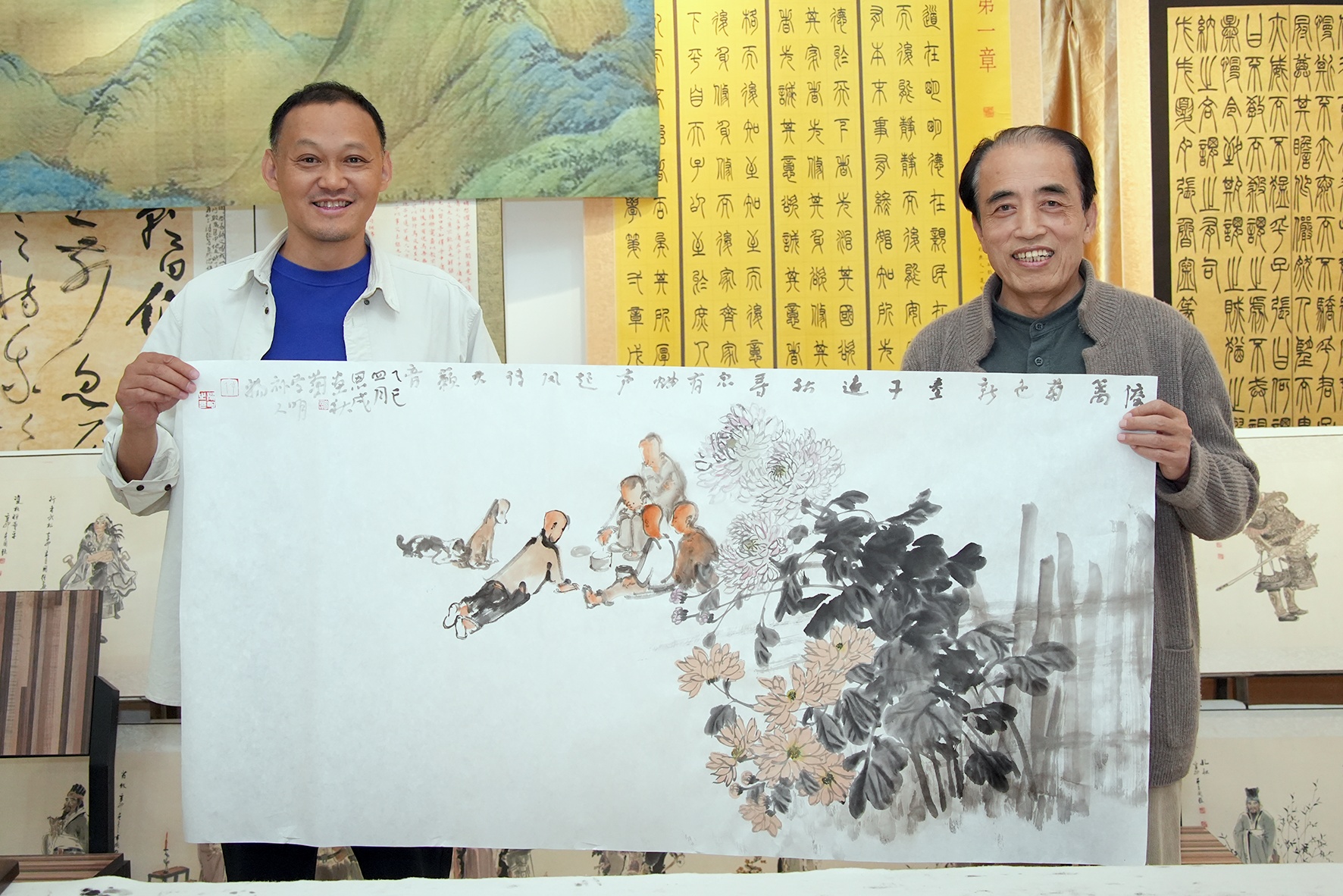 “这次我与李学明先生完成了一场金秋对话。我以没骨法晕染的秋菊层层叠浪,绛紫与鹅黄在生宣上凝结寒露;李先生笔下的童子执草引虫,衣袂翻飞处似能听见蛐蛐罐里的金石之音。当傲霜之花遇见秋虫私语,水墨世界便漾开了五谷丰登的涟漪——这是农人俯身拾穗时瞥见的诗意,亦是天地馈赠给勤劳者的童话书页。