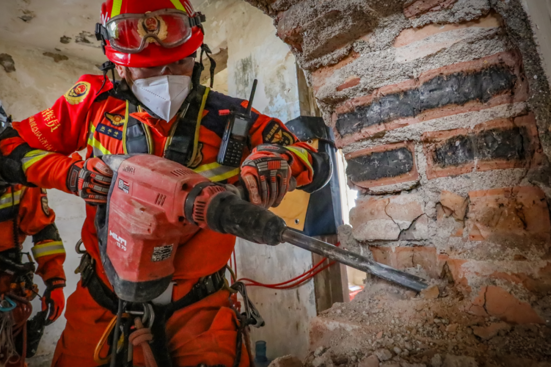 作为指挥员,张其峰全神贯注,时刻观察队员状态,安排人员轮换,同时科学指挥队员使用冲击钻、往复锯、砂轮锯等工具逐点对坑道混凝土进行破拆、利用剪切工具对障碍物“洗衣机”进行切割,随着时间一点点流逝,“生命通道”顺利打通。