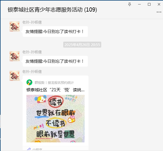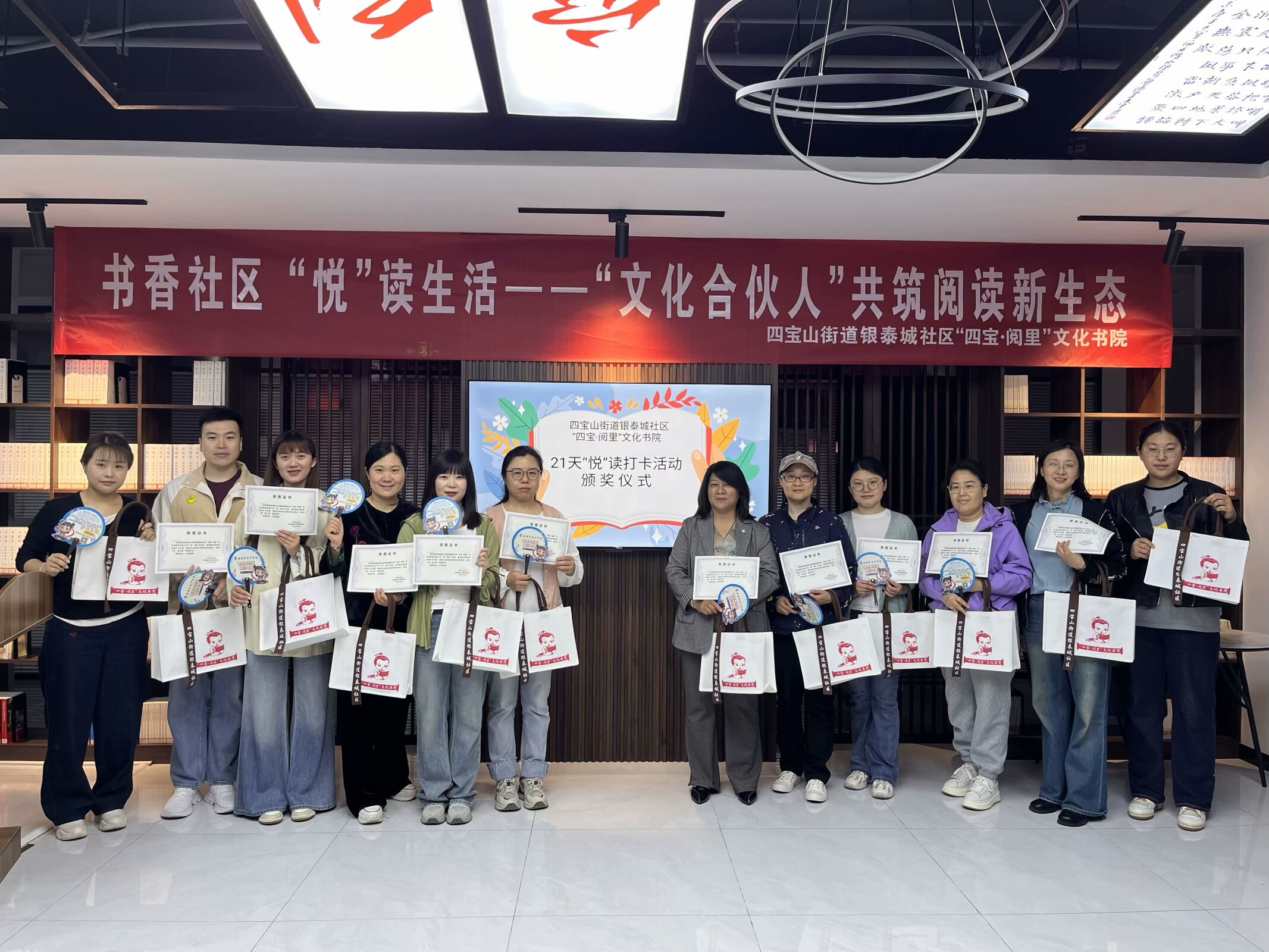 “每天读书一小时,坚持21天就能点亮‘阅读之星’!”自读书月活动启动以来,银泰城社区采取线上打卡小程序的方式,为居民定制“阅读打卡计划”,鼓励社区居民在21天内坚持阅读,不限年龄、不限性别、不限书籍类型,只要是积极向上、传递正能量的书籍,均可作为阅读对象。这一创新方式不仅打破了时间和空间的限制,还极大地激发了社区居民的阅读热情。