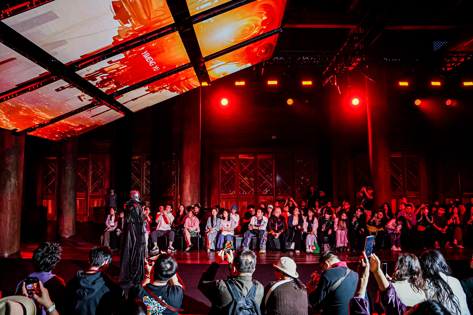 《器生幻形》不仅是一场科技时尚的展示,更是一次关于“人机关系”与“身份流动性”的艺术实验。整场大秀以3台人形机器人为走秀模特,融合数字孪生模块化3D打印时装系统、生成式AI影像背景、东方山海经音乐和中国红视觉氛围,在古典中式建筑水上禅堂中完成一场虚实交织、跨界融合的时装行为艺术表演。