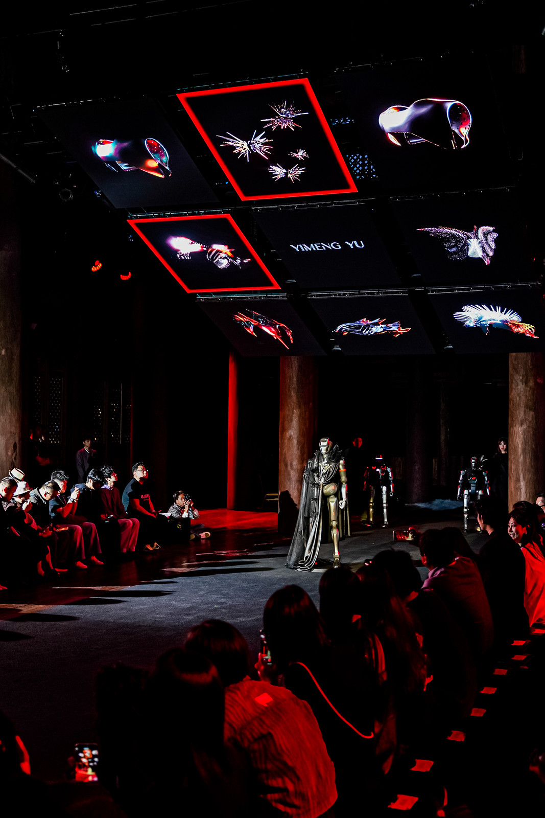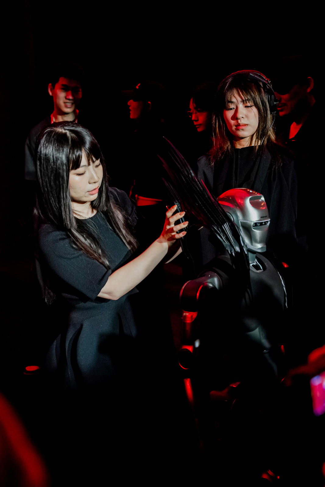 同时,机器人在每一次登场时,其所穿戴的服装组件亦会在秀场的大屏幕上同步“点亮”,形成一种类似于“游戏装备切换”的动态视觉系统,为观众带来沉浸式的交互体验。秀场中还特别设置了设计师余一萌亲自为机器人更换模块服装的行为艺术环节,不仅展现了人作为创造者与技术实体之间的动态协作过程,也寓意着设计师意图打破传统“服装-身体”关系的边界,重新探讨在智能时代背景下,人机之间身份、角色与感知的流动与重构。