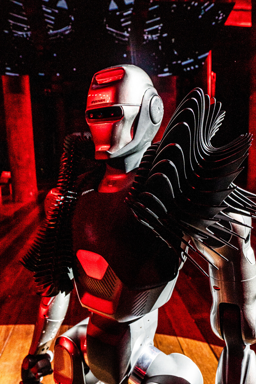 作为机器人“模特”的PM01众擎机器人由深圳团队打造,其在外观与行动机制上均展现前沿科技水准:超音速灰金属机身、航空级铝合金外壳、家族式星环灯设计以及基于神经网络的自然步态控制系统,打破传统机器人“机械僵硬”的刻板印象,实现真正意义上的“人类化步态”。因此在设计策略上,余一萌选择突出机器人原有的机械结构美感,而非进行遮蔽式覆盖。她刻意避开全包身式设计,保留并强化机器人本体的结构细节,从而在跨界合作中实现服装设计与工业美学的“双向赋能”。
