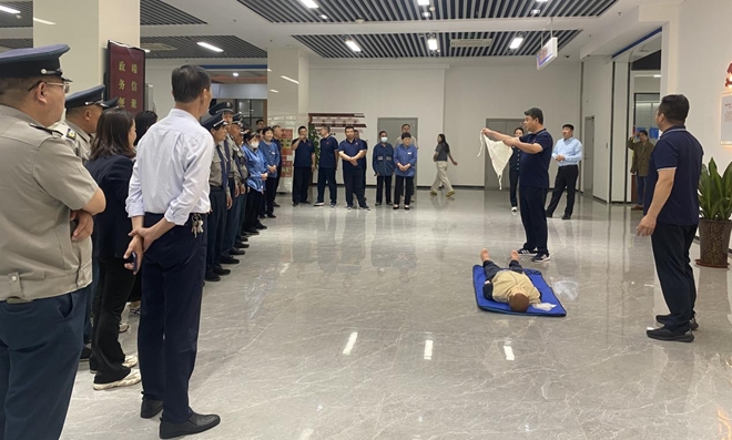 在三角巾包扎教学环节,工作人员对头部、手臂、腹部等不同部位的包扎方法进行分步讲解,强调包扎的力度、角度和固定技巧。此次培训有效提升了群众和大厅服务人员的自救互救能力,为应对突发紧急状况奠定了坚实基础。