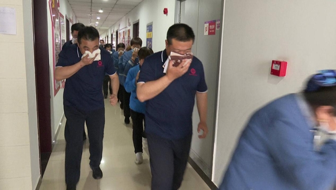 在区人防消防大楼防火疏散演练现场,随着警报声响起,工作人员迅速组织集中办公人员用湿毛巾捂住口鼻,弯腰低姿,按照预定疏散路线快速、有序地撤离“火灾”现场。