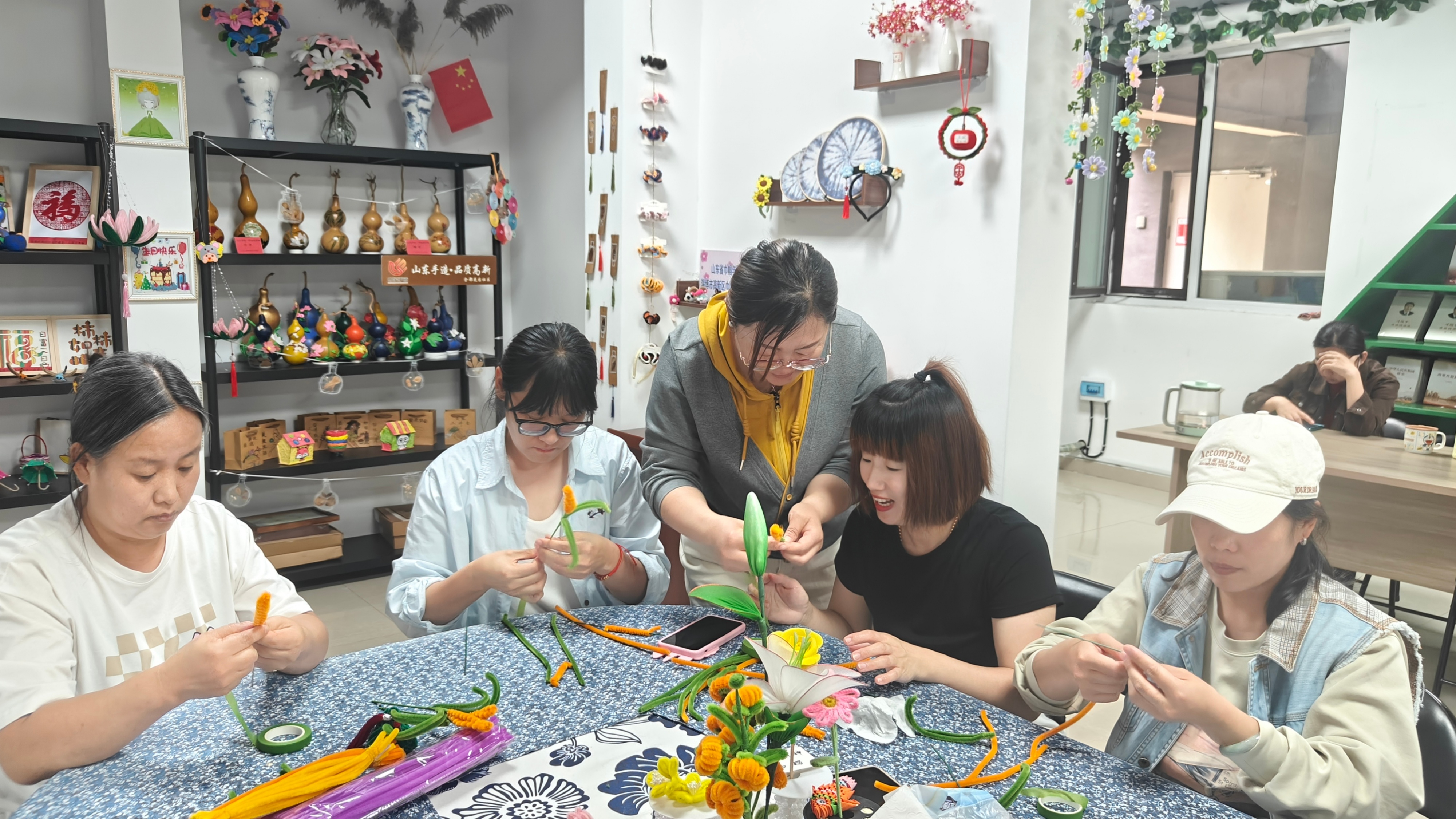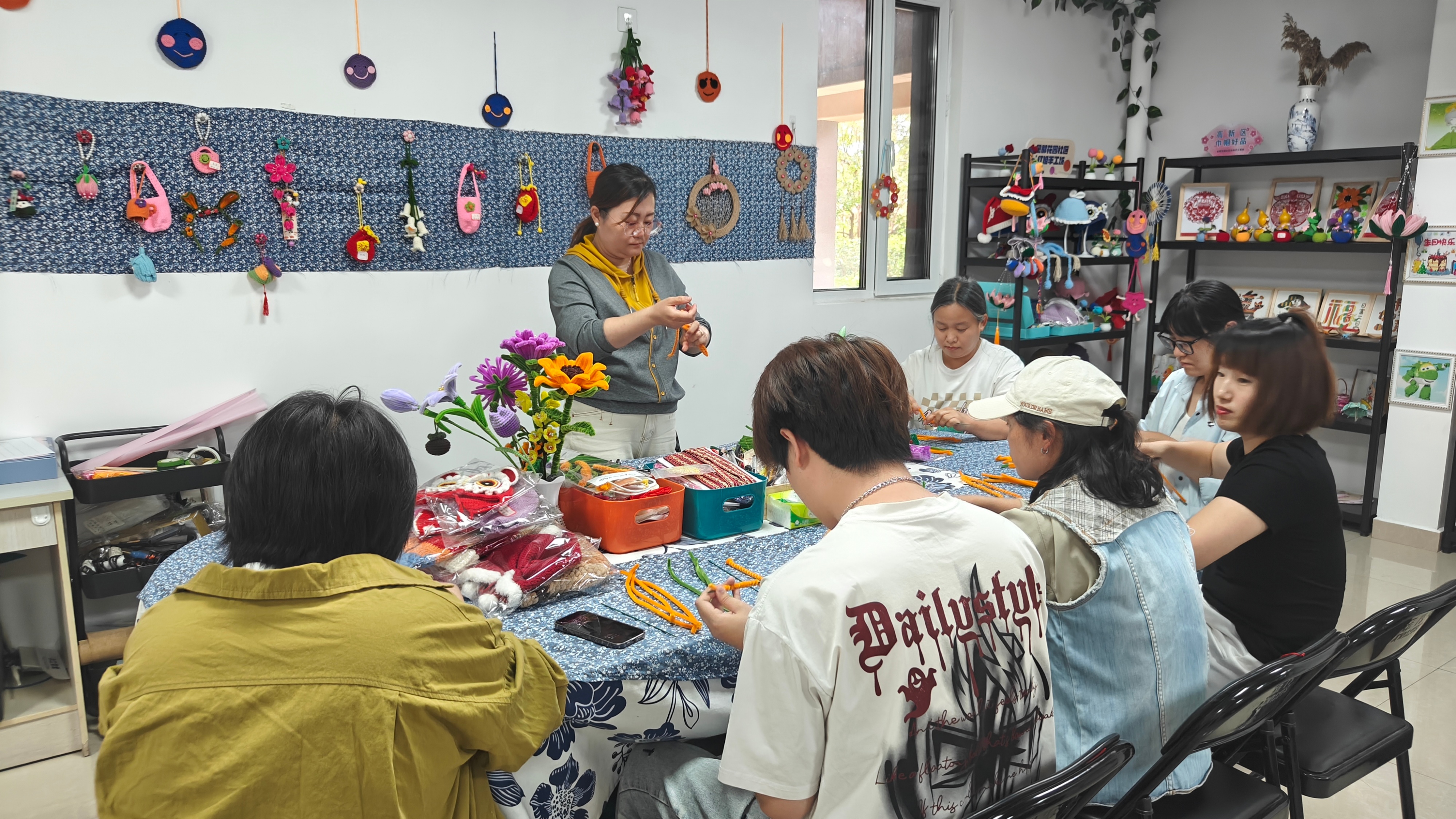 手工课环节,家长朋友在社区手工志愿老师的指导下,提升了动手技能,学会了编绳,制作出一个个造型可爱的作品。
