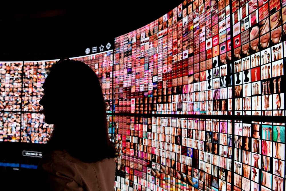 2019年5月16日,一名女子在法国巴黎“科技万岁”科技创新展上参观化妆品展台。新华社/法新