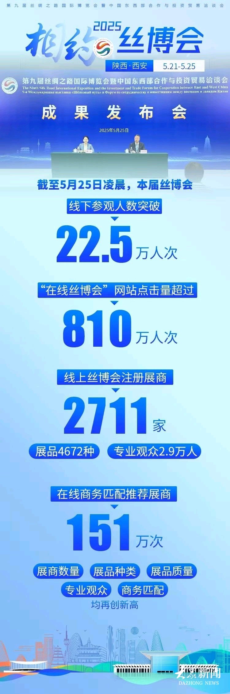 记者从会上了解到,截至5月25日凌晨,本届丝博会线下参观人数突破22.5万人次,“在线丝博会”网站点击量超过810万人次,线上丝博会注册展商2711家、展品4672种、专业观众2.9万人,在线商务匹配推荐展商151万次,展商数量、展品种类、展品质量、专业观众、商务匹配均再创新高。