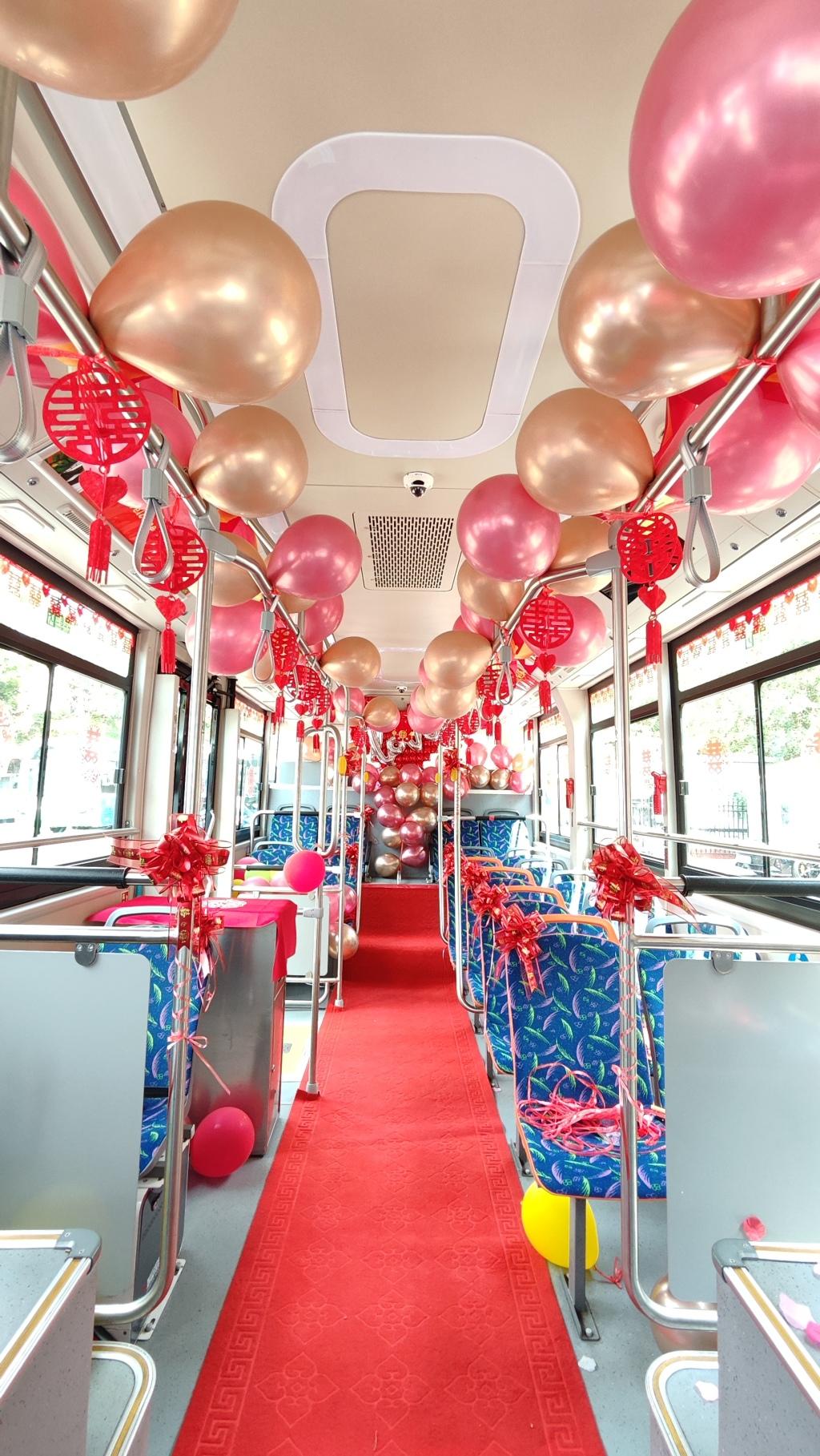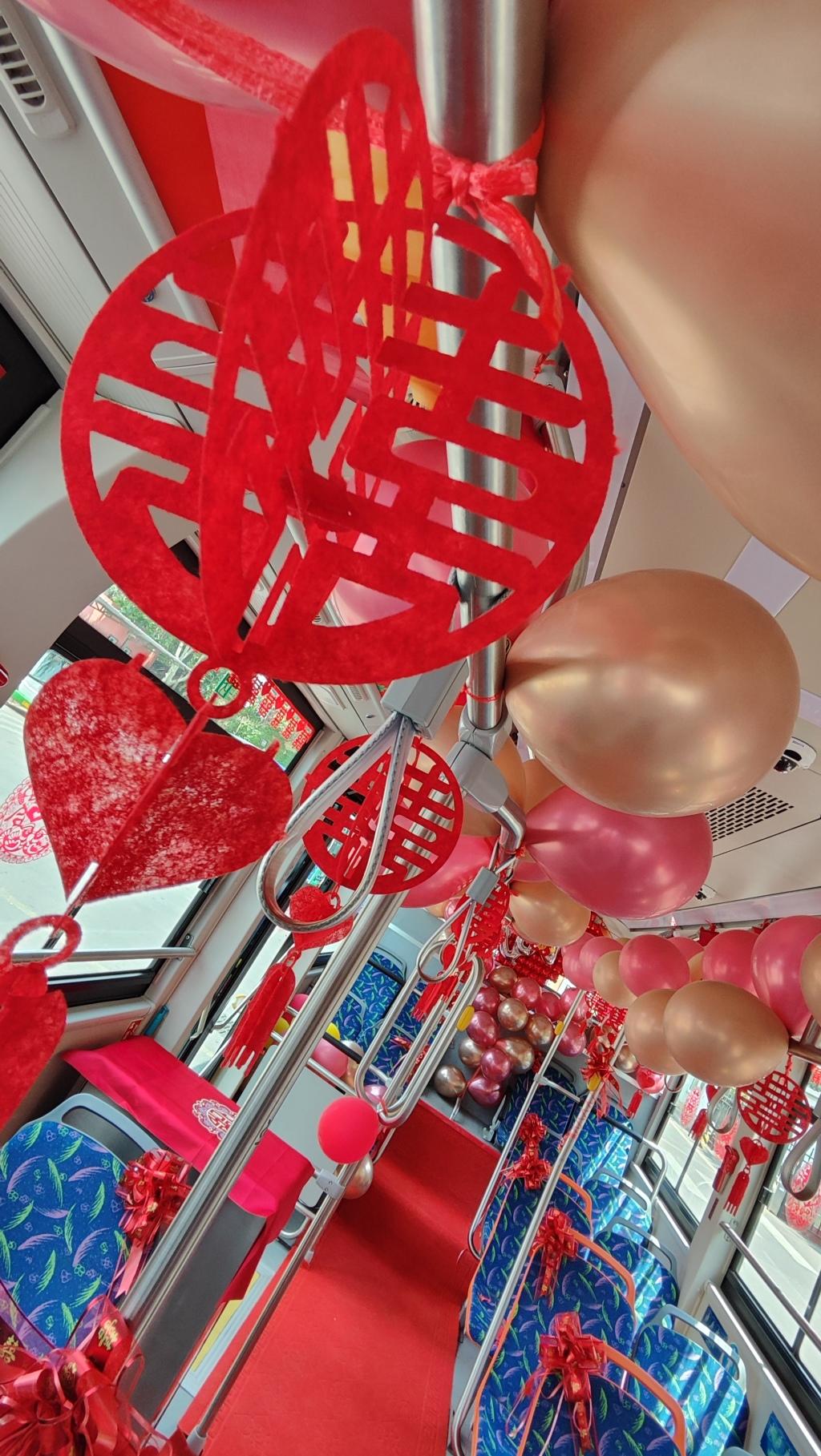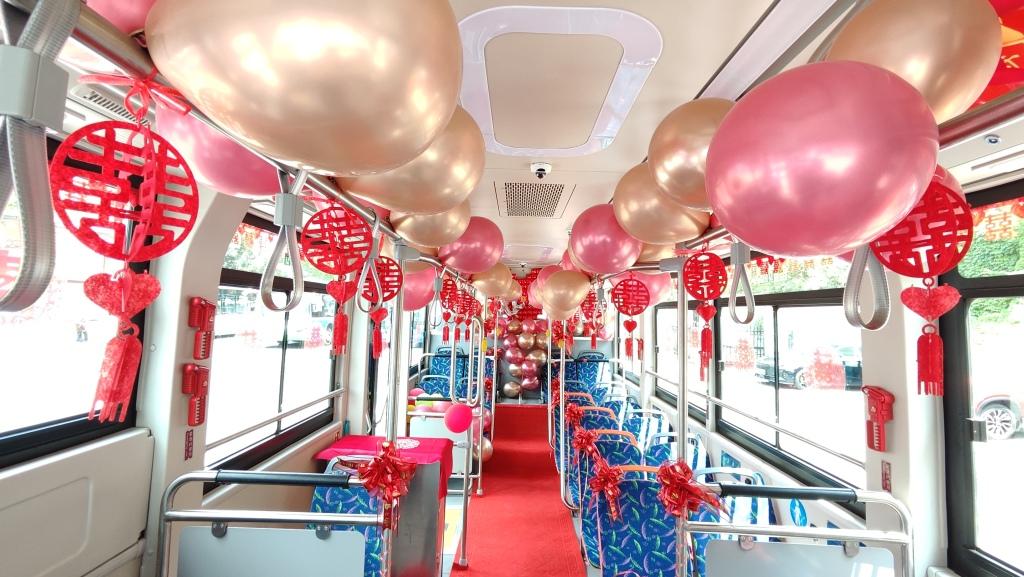 婚礼当天,公交婚车从场站驶出,沿着金水路、重庆中路、京口路驶向酒店。车厢内,大红囍字、玫瑰花瓣和爱心造型的大气球营造出浓郁的喜庆氛围。接亲路上,车厢里播放着歌曲《今天你要嫁给我》《执子之手》,新人和亲友们一路欢声笑语,拍照留念,共同见证这一浪漫时刻。过程中,亲友们还组织了一场“接亲快问快答”,引得众人哄笑。