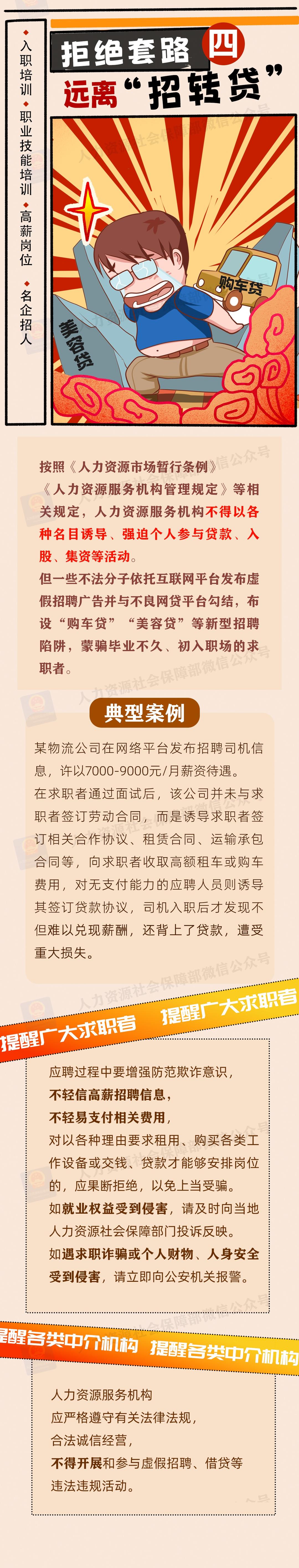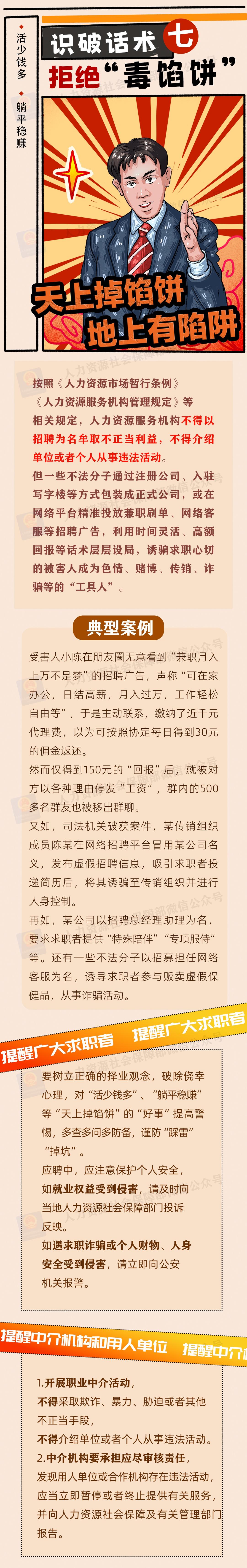 为加强风险防范,人力资源社会保障部、中央网信办、教育部联合发布招聘欺诈典型案例,揭示不法分子的惯用手法和话术套路,帮助高校毕业生等广大求职者提高风险识别意识,增强自我保护能力。一起来看——