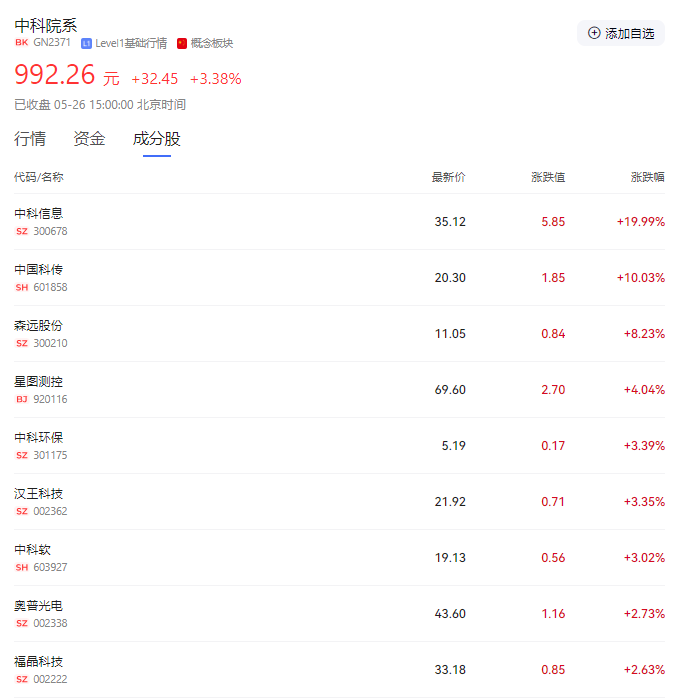 二级市场上,海光信息(市值超3000亿)吸收合并中科曙光(市值超900亿)引爆A股。5月26日,海光信息、中科曙光停牌,截至收盘,中科院系概念股齐刷刷大涨,中国科传涨停,中科信息20%涨停,中科美菱涨超16%,中科星图、中科三环、中科软、中科金财等个股均有明显涨势。芯片股也集体走强,至纯科技涨超5%,华虹公司、中国长城涨超3%,北方华创、中芯国际涨超1%。