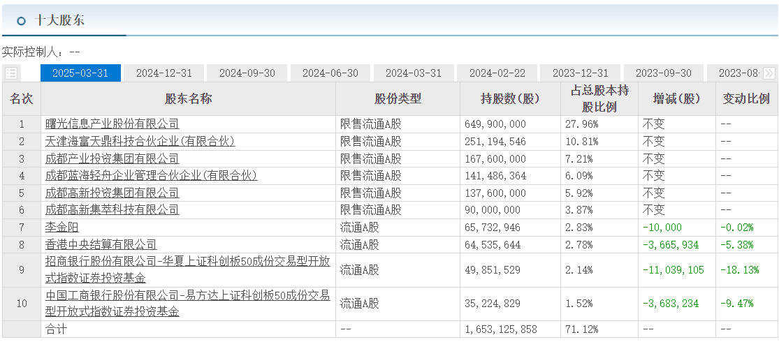 截至2025年一季度末,中科曙光是海光信息第一大股东,持股比例为27.96%。中科曙光实际控制人为中国科学院计算技术研究所。中院系概念股在5月26日集体出现异动或与之相关。