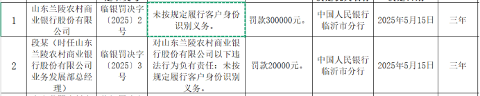 近日,中国人民银行山东省分行公示的行政处罚决定书(临银罚决字〔2025〕2号)显示,山东兰陵农村商业银行因未按规定履行客户身份识别义务被罚款30万元。