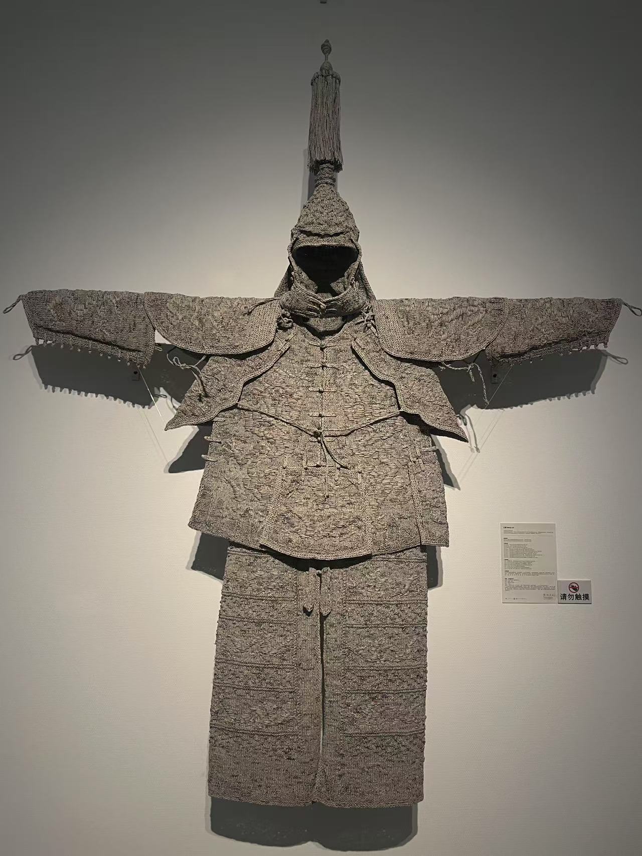 “这场展览中的所有作品都不是先从技术或者材料角度考虑创作,而是最注重思想性的表达。所有作品都是以纸为载体,进而萌生新的想法、反映对现实的思考。”导览过程中,王雷重点介绍了他创作的、名为《兵者无形》的作品。此作品以报纸为材料,通过搓线、编织技术将清朝康熙皇帝的“阅兵甲”与现代文化相结合,看似作者只是进行了单纯的形式语言复制,而事实上却通过解构与重组的方式,将战争与和平、武力与文化、脆弱与坚硬、历史与当下进行多重语言呈现。