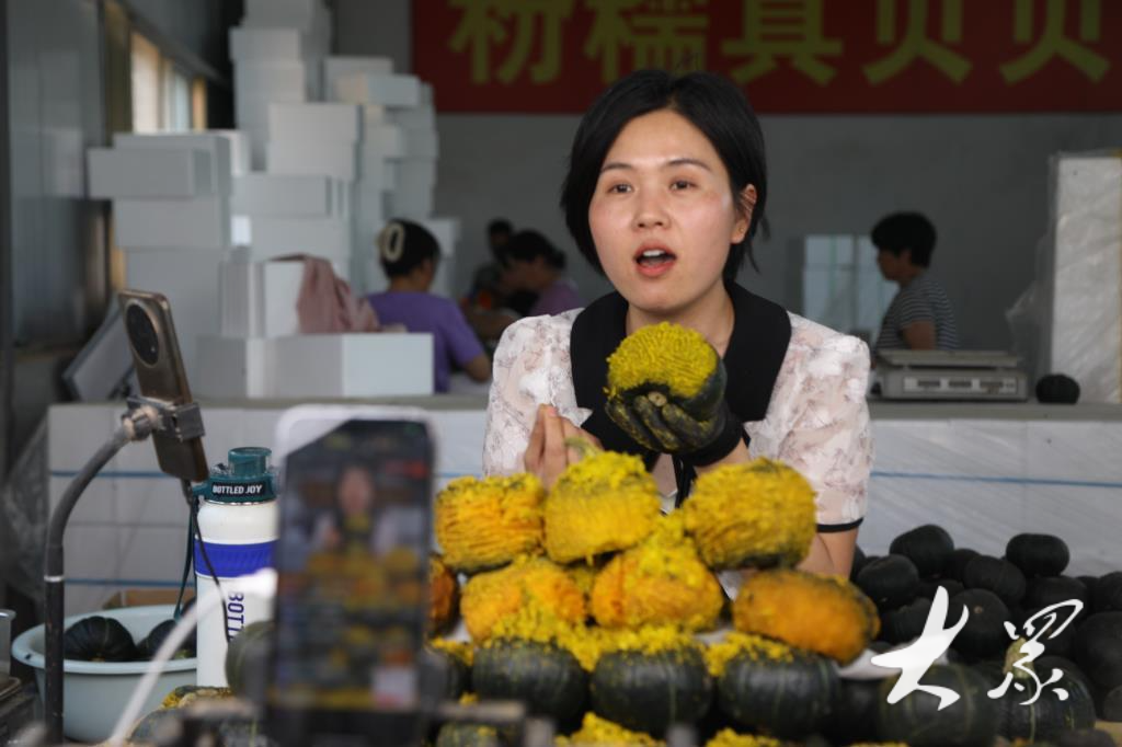 “现在我们线上各个平台账户的总粉丝已经上百万,而且粉丝黏性很高。我们专门请了7个主播直播带货,她们大多都是本村和周边村的年轻妈妈。现在高峰期每天能卖五六千单,主要产品就是地瓜和贝贝南瓜。”张甜甜说。由于销量很大,合作社还请了5名客服和20多个打包工人。