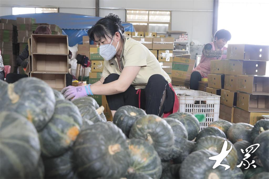 清晨的薄雾还未散去,新泰市禹村镇南峪村甜盛果蔬种植专业合作社里已是一片忙碌——打包的胶带声“滋滋”作响,快递的包装箱堆成小山,操着乡音的年轻人对着镜头热情吆喝。“咱家的贝贝南瓜,粉糯香甜,老人小孩都爱吃。”在该合作社包装车间,主播张月正为粉丝介绍产品。