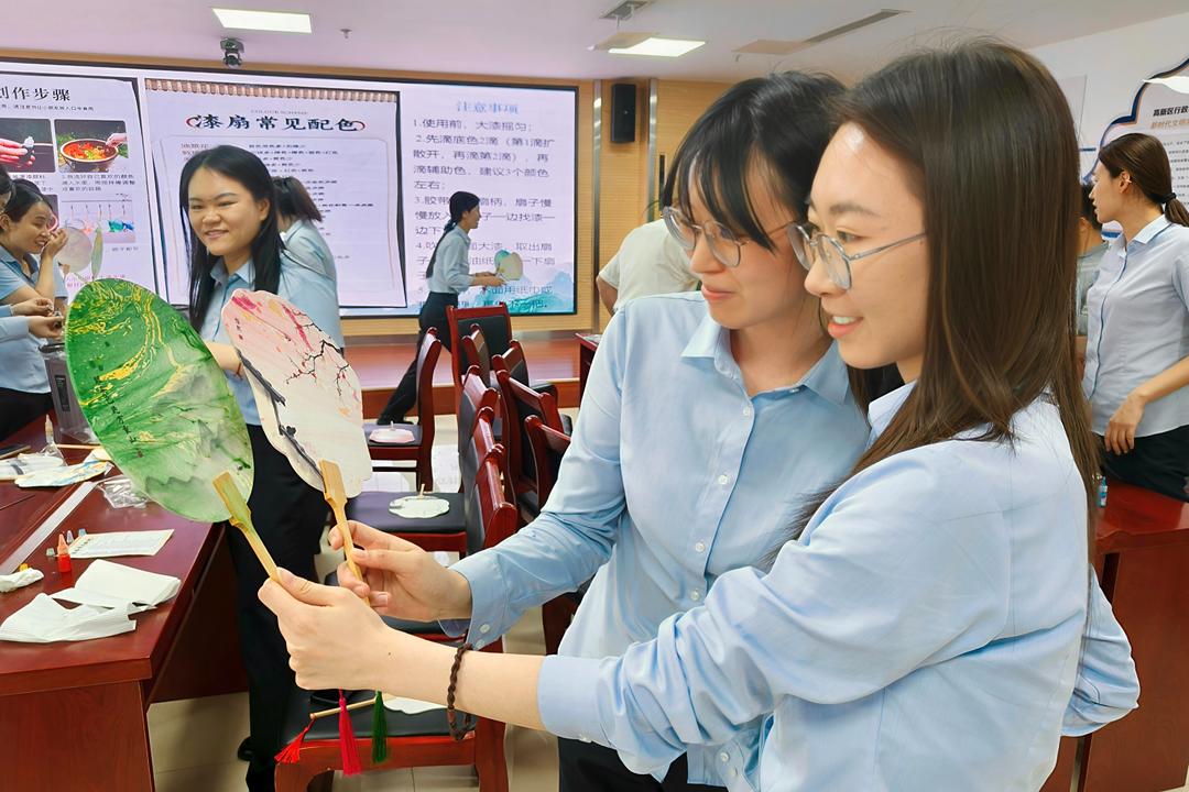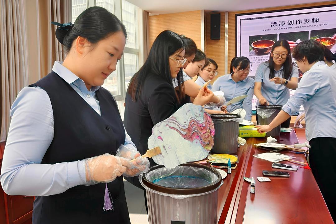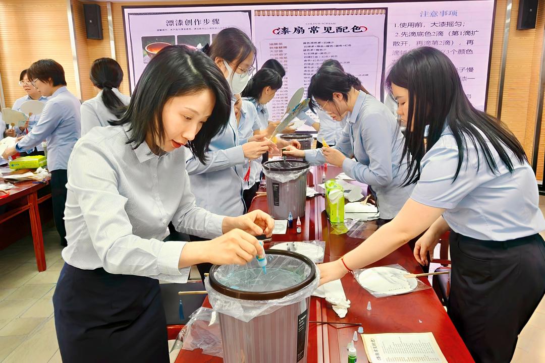 并非所有人都能一次成功。入职不久的迟宏岩第一次尝试时,扇面颜色绚丽,效果甚佳。她仔细观察后,调整浸入速度和旋转角度。经过两次尝试,让另一件漆扇作品更加精美。“这就像我们的政务工作,需要不断摸索、调整,才能达到理想效果。”政务工作人员王茜感慨道。