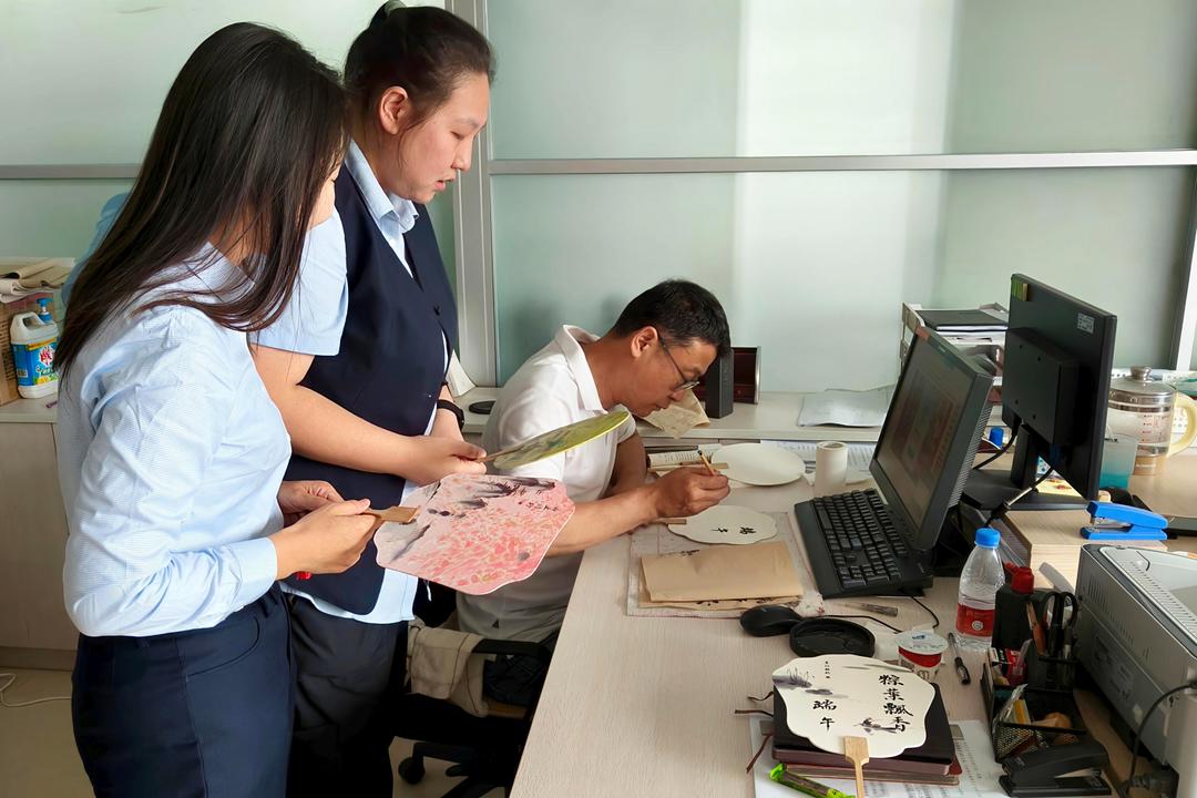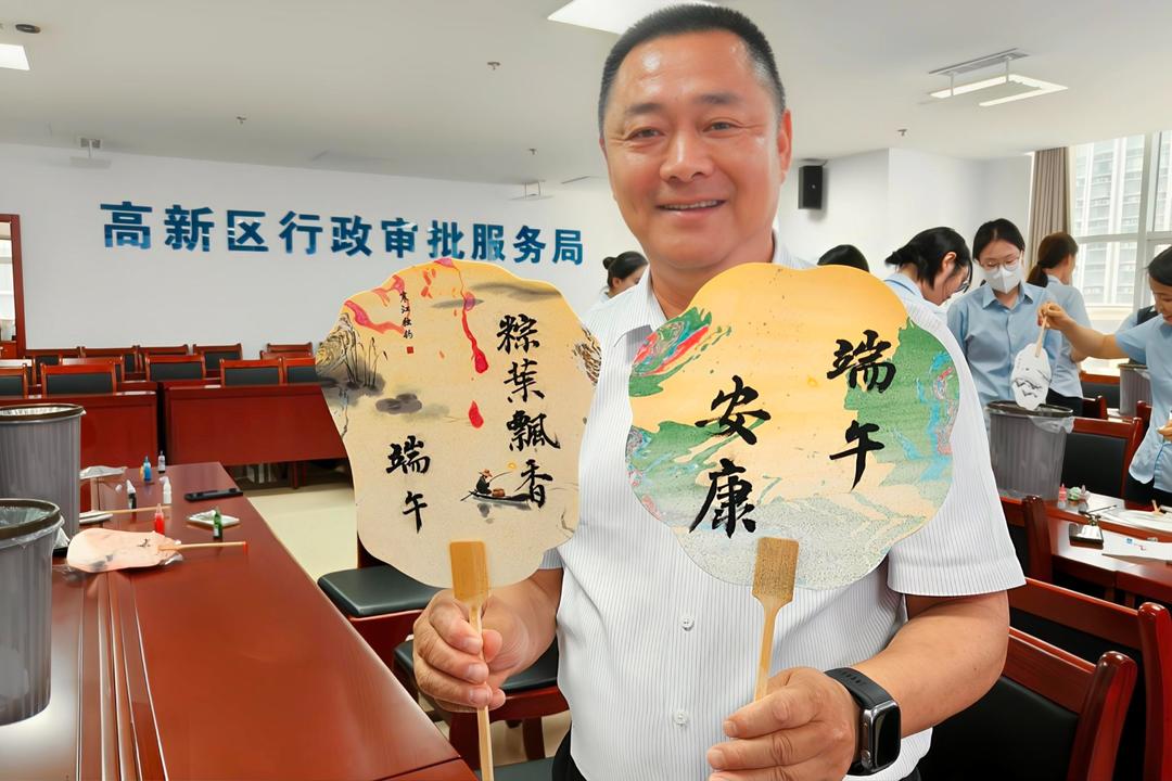 粽叶飘香,文化端午。5月29日下午,淄博高新区行政审批服务局的活动室里,摆满了水桶、漆料和白面扇子。一场别开生面的“我们的节日・端午节”漆扇DIY活动在此举行,30名政务服务人员放下手头工作,化身“非遗体验官”,探寻千年漆扇技艺的奥秘。